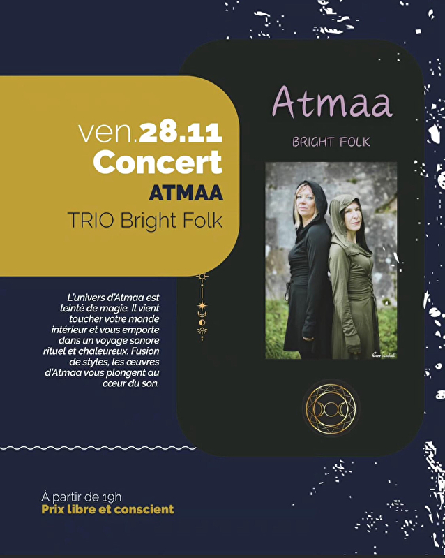 Trio bright folk aux influences néo chamaniques et world spiritual, l’univers d’Atmaa est teinté de magie. Il vient toucher votre monde intérieur et vous emporte dans un voyage sonore rituel et