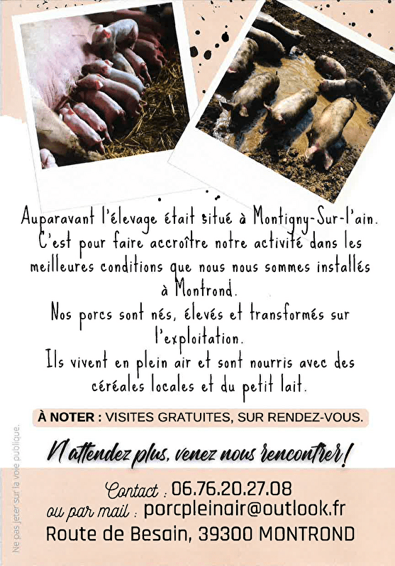 Élevage de porcs en plein air nourris avec des céréales locales et du petit lait. Visite gratuite et sur réservation.