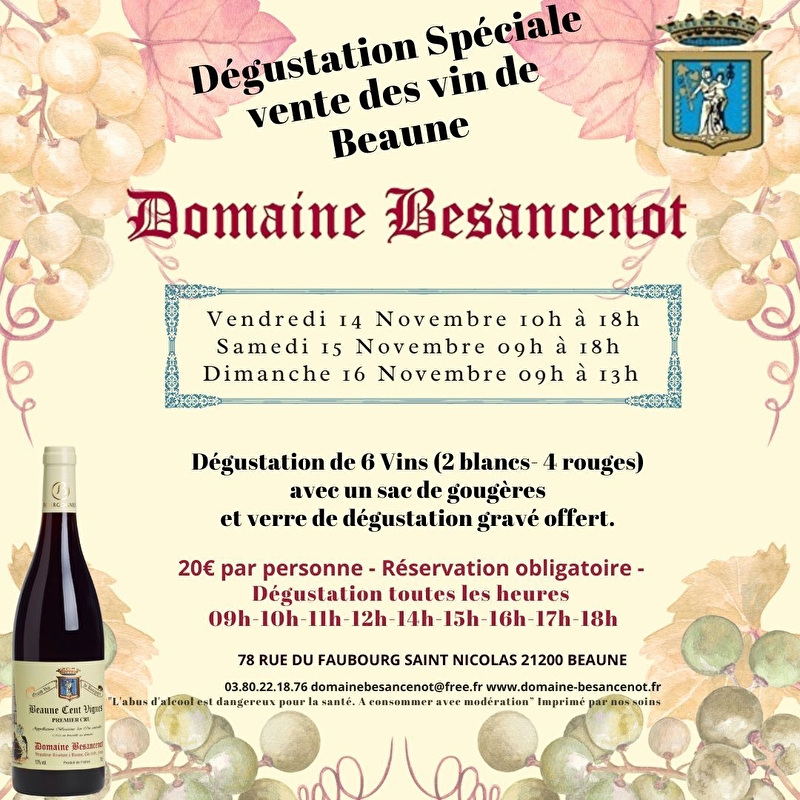 Vigneron depuis 6 générations, situé à Beaune, faubourg Saint Nicolas à Beaune (direction route de Savigny les Beaune), le Domaine Besancenot façonne ses vins dans le respect de la tradition bourguignonne et vous propose une dégustation spéciale « Ventes des Vins de Beaune » :