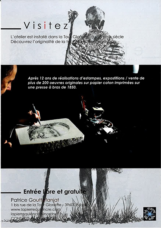 Après des cours et des stages de dessin et de lithographie dans le Jura et en Alsace, Patrice Gouttefanjat s’établit dans son atelier à la tour Gloriette en 2013. Autodidacte passionné et passionnant, son amour pour le dessin et la technique lithographique s’exprime à travers ses créations, réalisées entièrement à la main, sur une presse réhabilitée par ses soins.