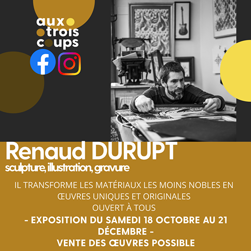 Renaud Durupt est un artiste aux multiples facettes, dont le travail se déploie entre sculpture, illustration et gravure. Son approche singulière réside dans sa capacité à transformer des matériaux modestes, parfois considérés comme « les moins nobles », en œuvres uniques et surprenantes.