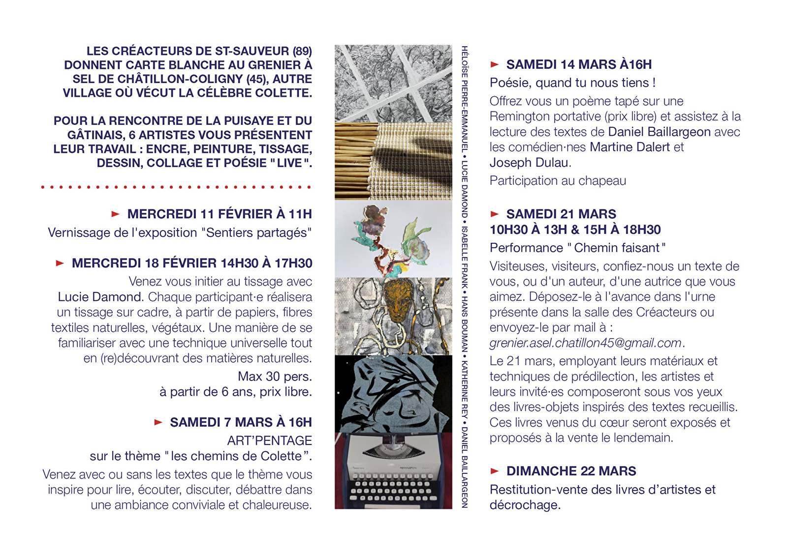Les Créacteurs à Saint-Sauveur-en-Puisaye donnent carte blanche au grenier à sel de Châtillon-Coligny, autre village où vécut la célèbre Colette. Pour la rencontre de la Puisaye et du Gâtinais, six artistes vous présentent leur travail : encre, peinture, tissage, dessin, collage et poésie "live".