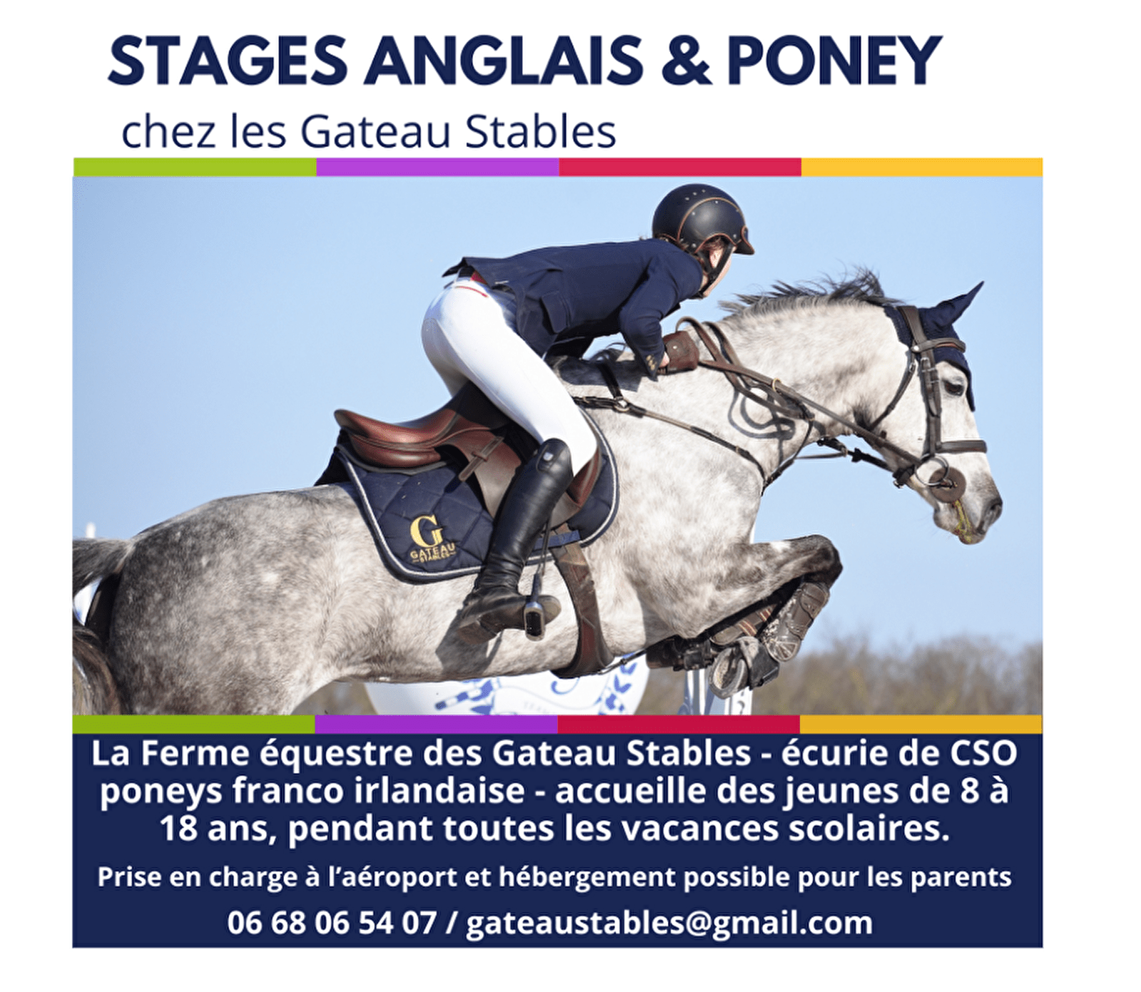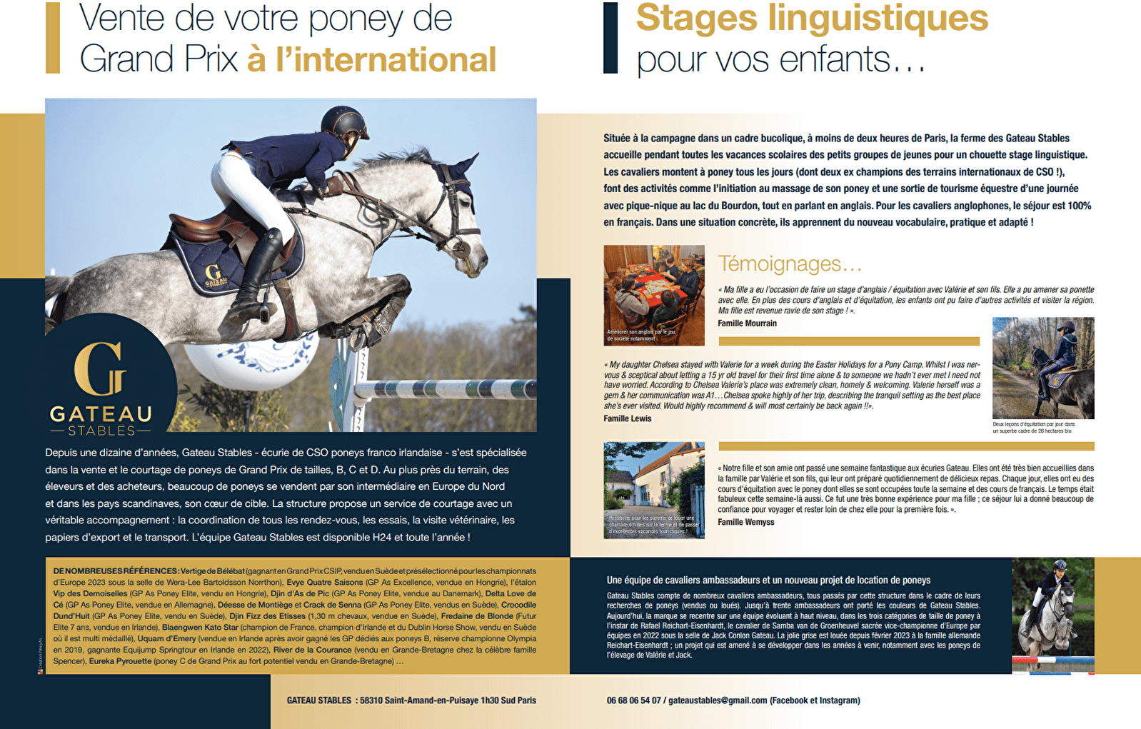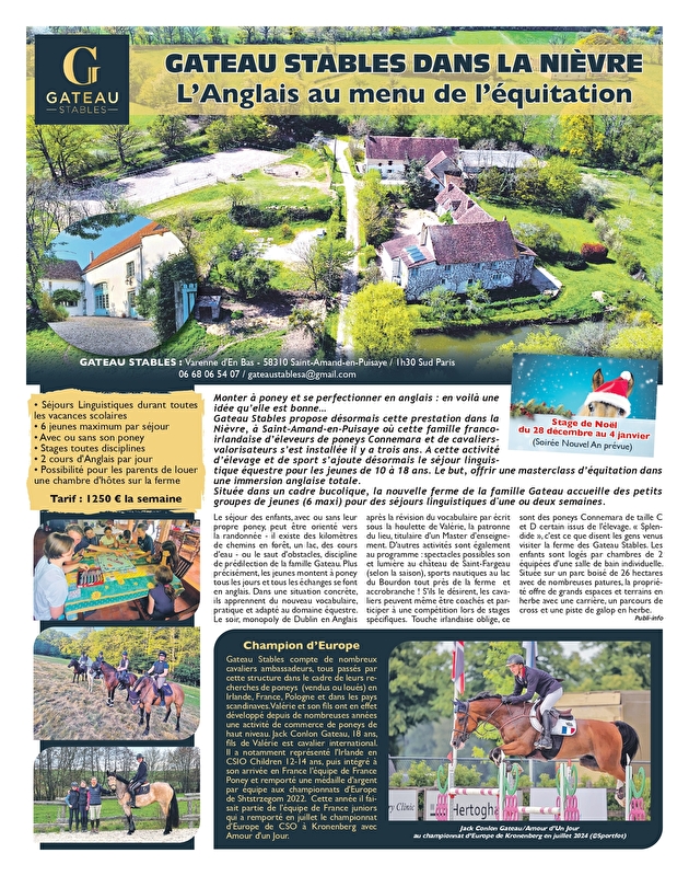 Gateau Stables est une famille de cavaliers de CSO franco-irlandaise médaillée européenne installée sur un domaine équestre de 26 hectares au cœur de la Puisaye, dans la Nièvre bucolique, tout près du château Médiéval de Guédelon à 2h au sud de Paris. L'Irlande comme si vous y étiez en France.
