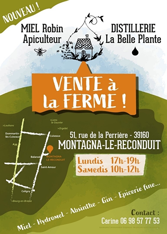 Cette vente à la ferme aura lieu tous les lundis de 17h à 19h et les samedis de 10h à 12h à la Distillerie la Belle Plante à Montagna-le-Reconduit.