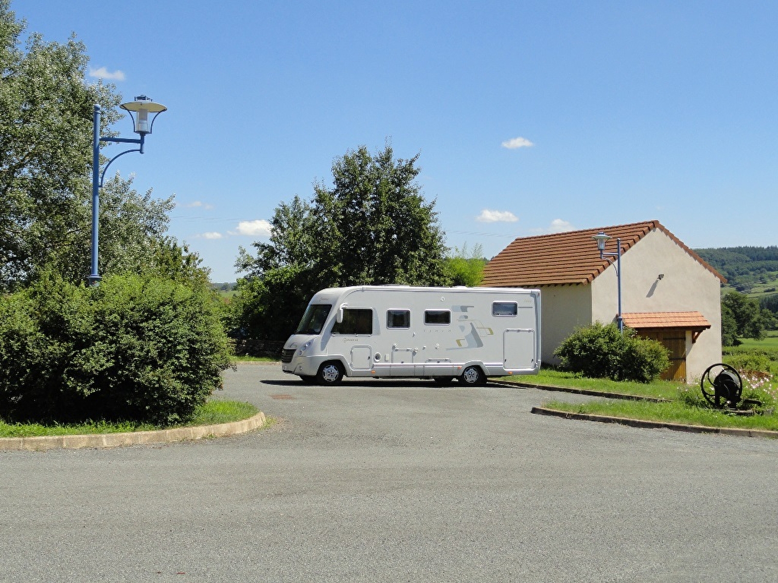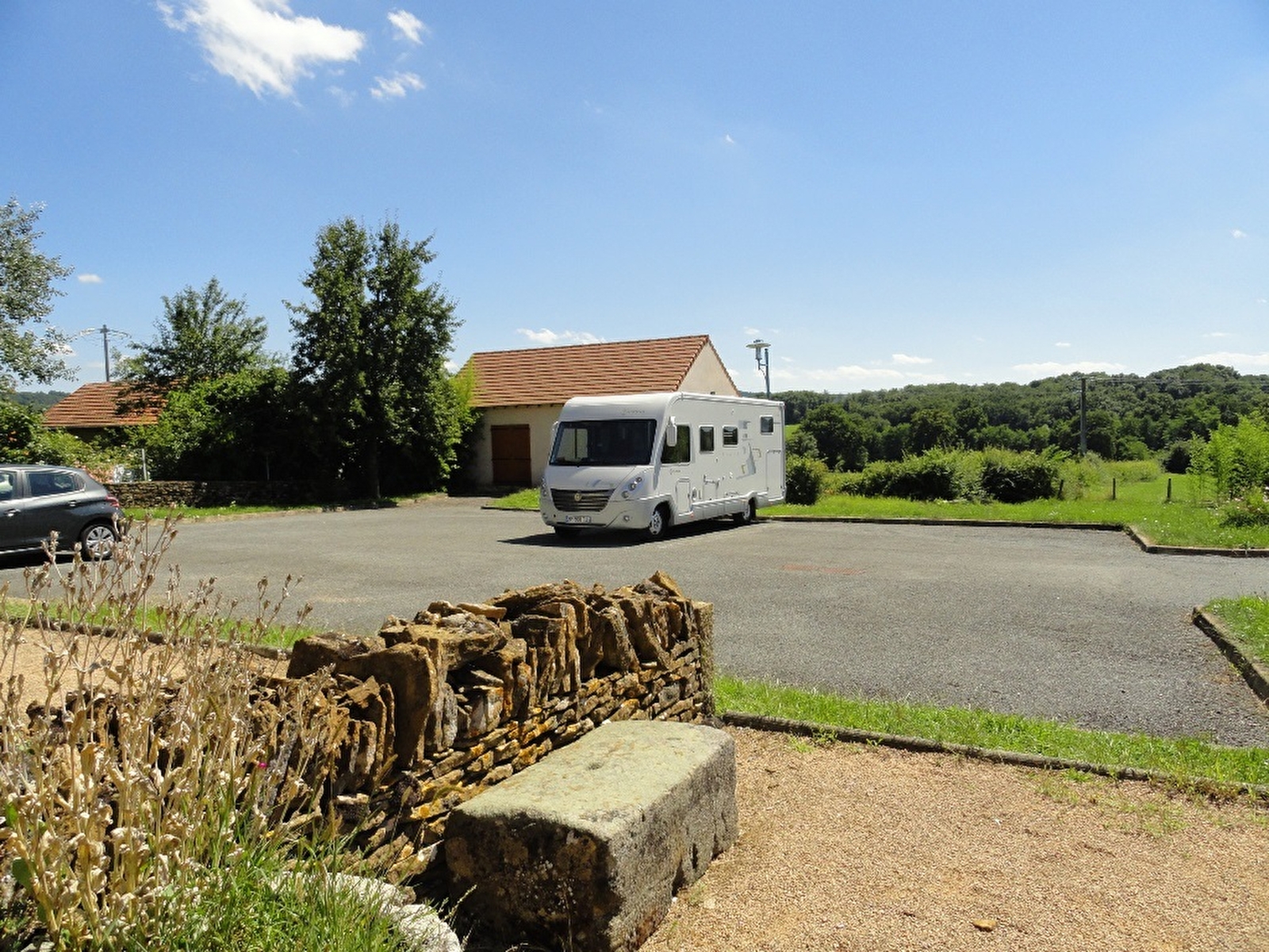 Parking goudronné légèrement en pente, prévoir des cales - peu ombragé.