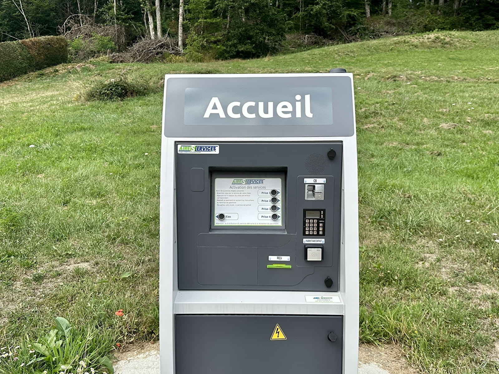 Aire de services pour camping-car. Services sur place : vidange eaux usées, ravitaillement en eau potable et branchement électrique. Paiement par carte (prix unitaire : 2 € pour l'eau et 3 € pour l'électricité).