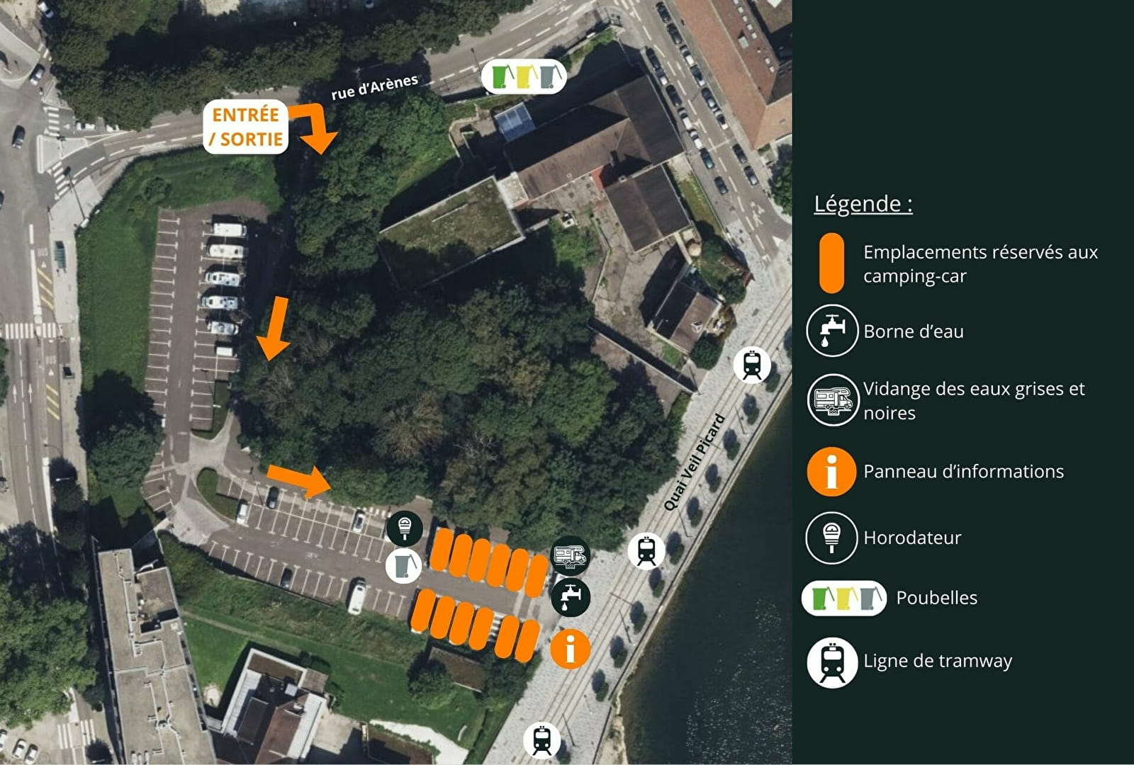 Transports en commun : basée à côté de l’arrêt de tram Canot, l’aire de camping-cars est située aux portes du centre-ville.