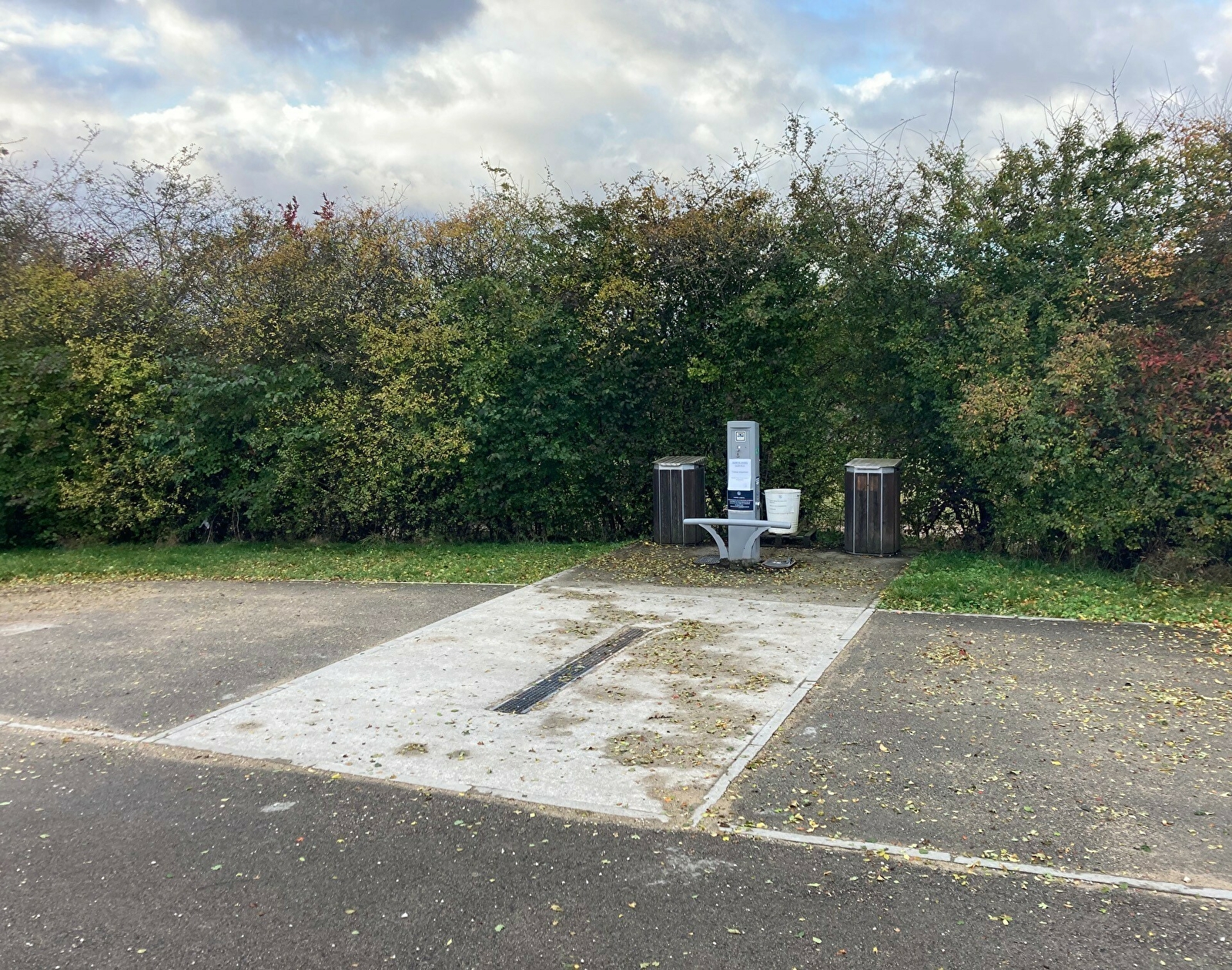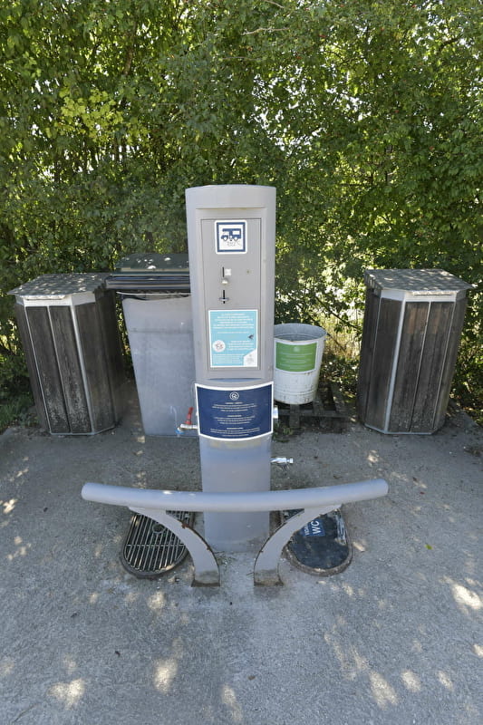 L'aire de service propose : une plateforme permettant la vidange des eaux grises (vaisselle, cuisine, douche) et des eaux noires (cassette des toilettes chimiques), ainsi qu'un point poubelles.