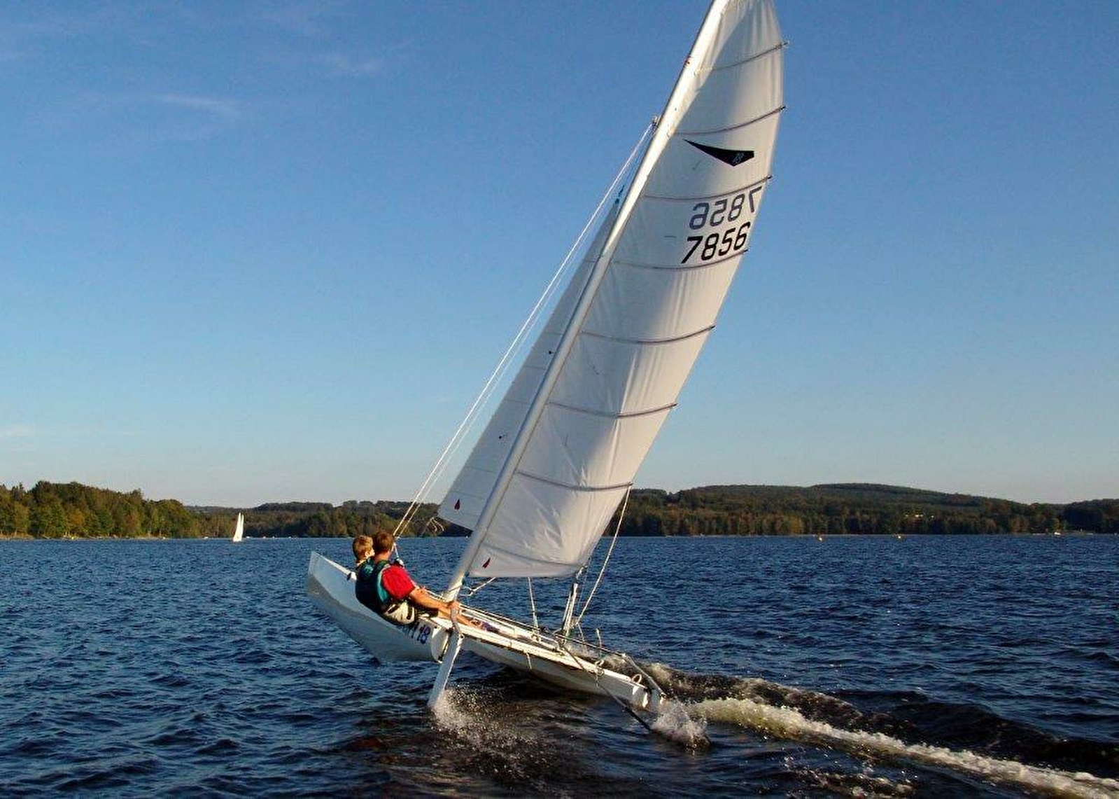 Catamaran de fabrication anglaise, cousin du fameux Hobbie Cat 16, adapté pour le perfectionnement et la sensation/frisson de glisse. Sur demande nous pouvons vous fournir les culottes de trapèze pour donner encore plus de sensations à vos équipiers.