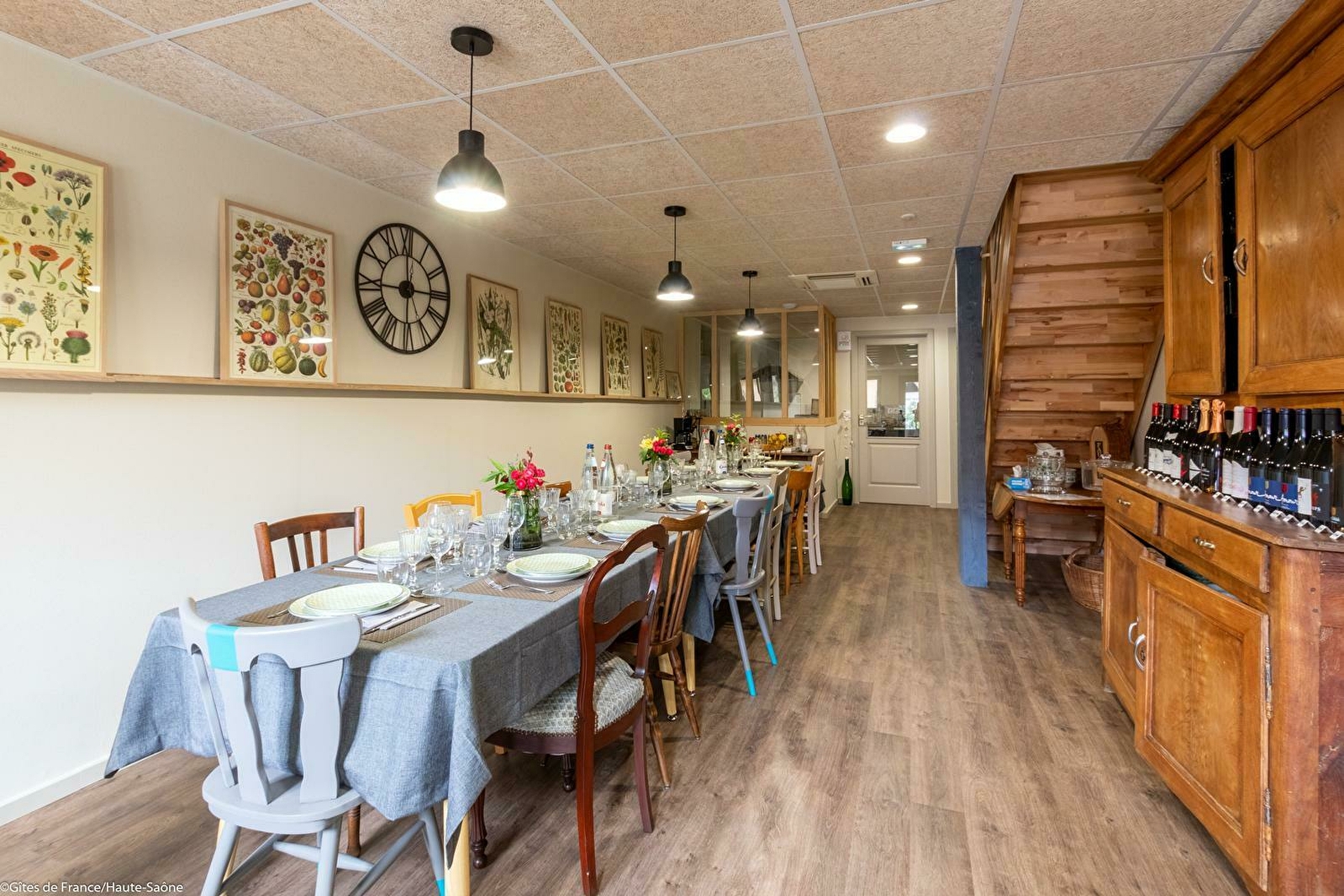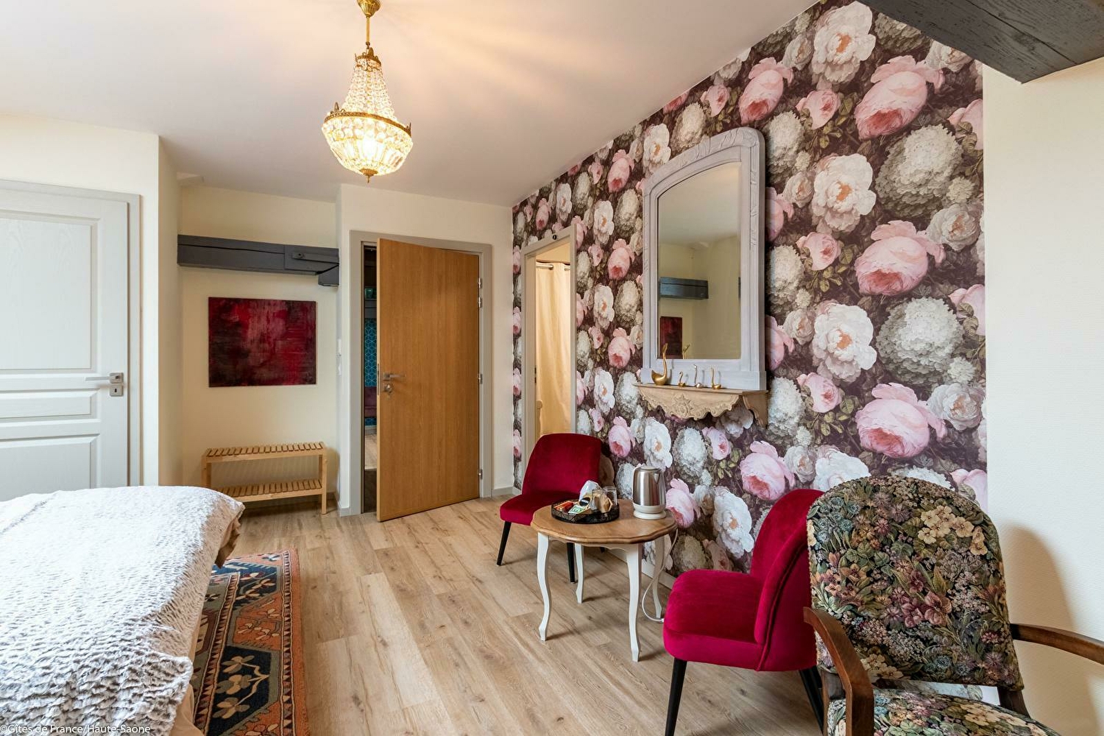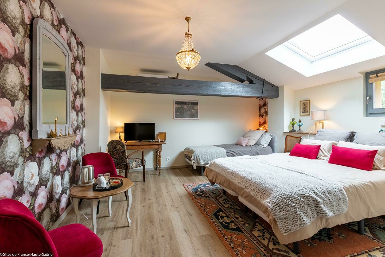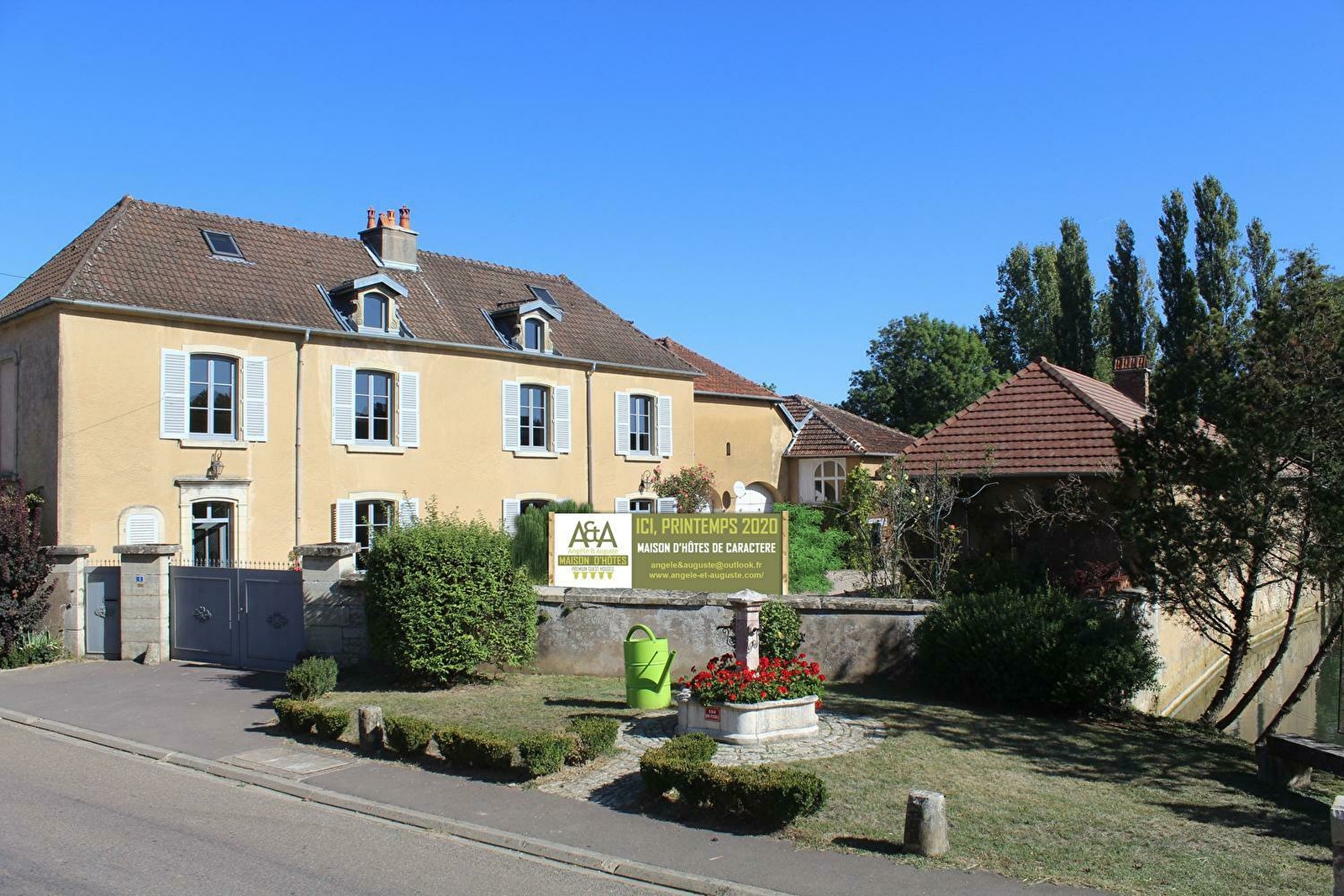 La maison d'hôtes Angèle et Auguste vous offre un cadre de vacances idéal pour vous ressourcer. Tout est soigneusement pensé pour un séjour aux petits soins. Cette magnifique maison de maître vous séduira par son charme et son caractère. Vous pourrez profiter du vaste jardin et de la douceur du cours d'eau qui berce la longère, où un coin "pêche" est aménagé spécialement pour les petits pêcheurs en herbe! Quand le soleil estival est présent, plongez dans l'eau turquoise de la piscine...et installez vous sous le pommier pour une lecture bucolique... Bienvenue, respirez la douceur de vivre, vous êtes chez "Angèle & Auguste"... Envie de vivre un week-end romantique, prolongez ces instants, avec l'espace bien-être : sur place, un sauna (infrarouge), possibilité de massages (sur réservation et avec supplément), un coin tisanerie et bibliothèque. La table d'hôtes est servie au rez-de-chaussée. Une salle de réunion de 20 personnes est disponible (sur réservation), pour les séminaires, exposition, stage... (paper board, vidéo projecteur, wifi). À l'étage, 5 chambres spacieuses à la décoration "campagne chic", avec pour chacune salle d'eau, wc indépendant et privatif, un espace bureau, bouilloire, cafetière, internet Wifi, sèche-cheveux. Peignoirs à disposition pour l’espace bien-être. Local vélo et moto. Table d'hôtes 28 €/personne, sur réservation. Possibilité de réserver les chambres Vannon et Vingeanne pour former la Suite V pour 170euros pour 4 personnes et 185 euros pour 5 personnes.