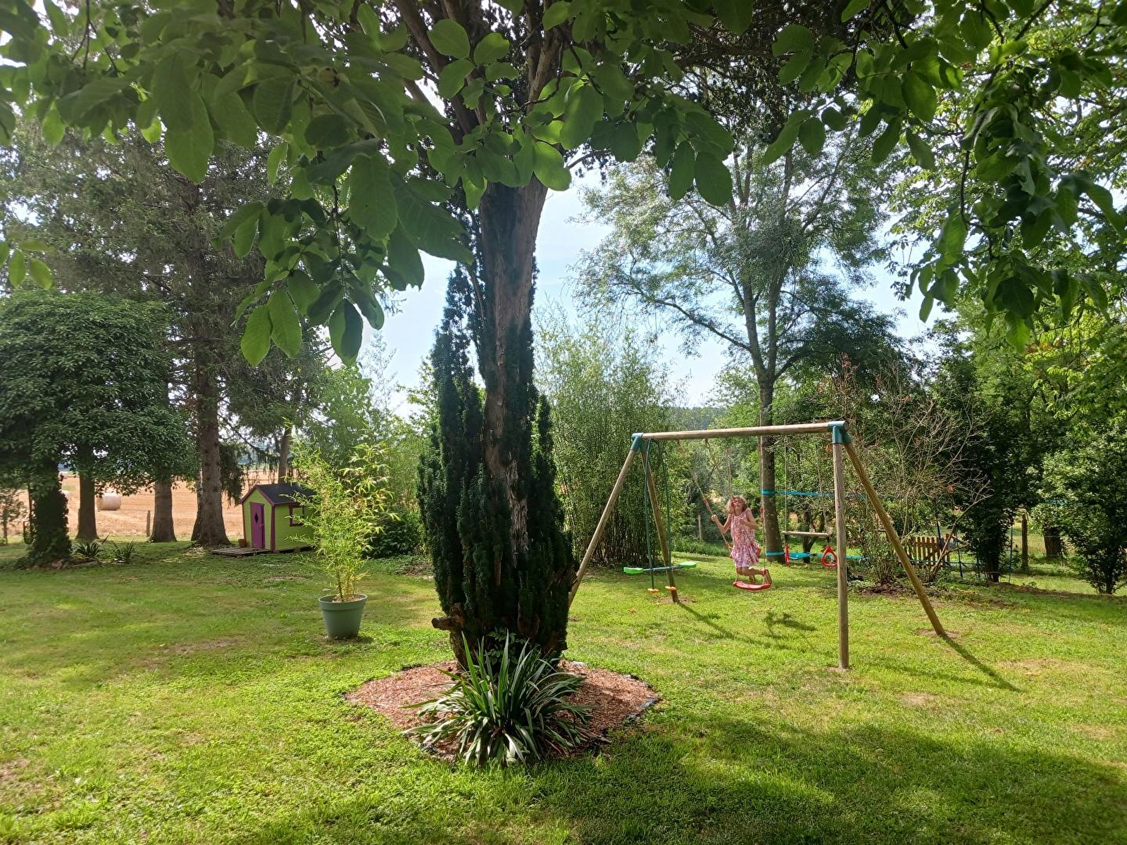 Composition : Aile totalement indépendante (mitoyenne habitation propriétaires). Wifi (fibre). Chauffage central fioul. Rdc : cuisine intégrée toute équipée (accès libre), séjour (poêle à bois) et salon avec baby-foot (accès direct au balcon et jardin). 1er étage : 1 chambre double (lit 2 p. 160x200cm) + 1 chambre familiale (lit 2 p. 160x200cm + lit 1 p. 80x190cm) avec salles de bain privées (1 baignoire / 1 douche / WC indépendant pour chaque) + chambre familiale composée de 2 chambres indépendantes communicantes (2 lits 2 p. 160x200cm + lit 1 p. 90x190cm + lit 1 p. 80x200cm en appoint sur mezzanine / accès échelle de meunier) avec sdb privée (baignoire/Wc). Balcon-terrasse abrité. Jardin 5000m². Piscine hors-sol (6x3m). Local vélos. Parking privé. Restaurant 3 km. Commodités 10 km. Paniers repas sur réservation.