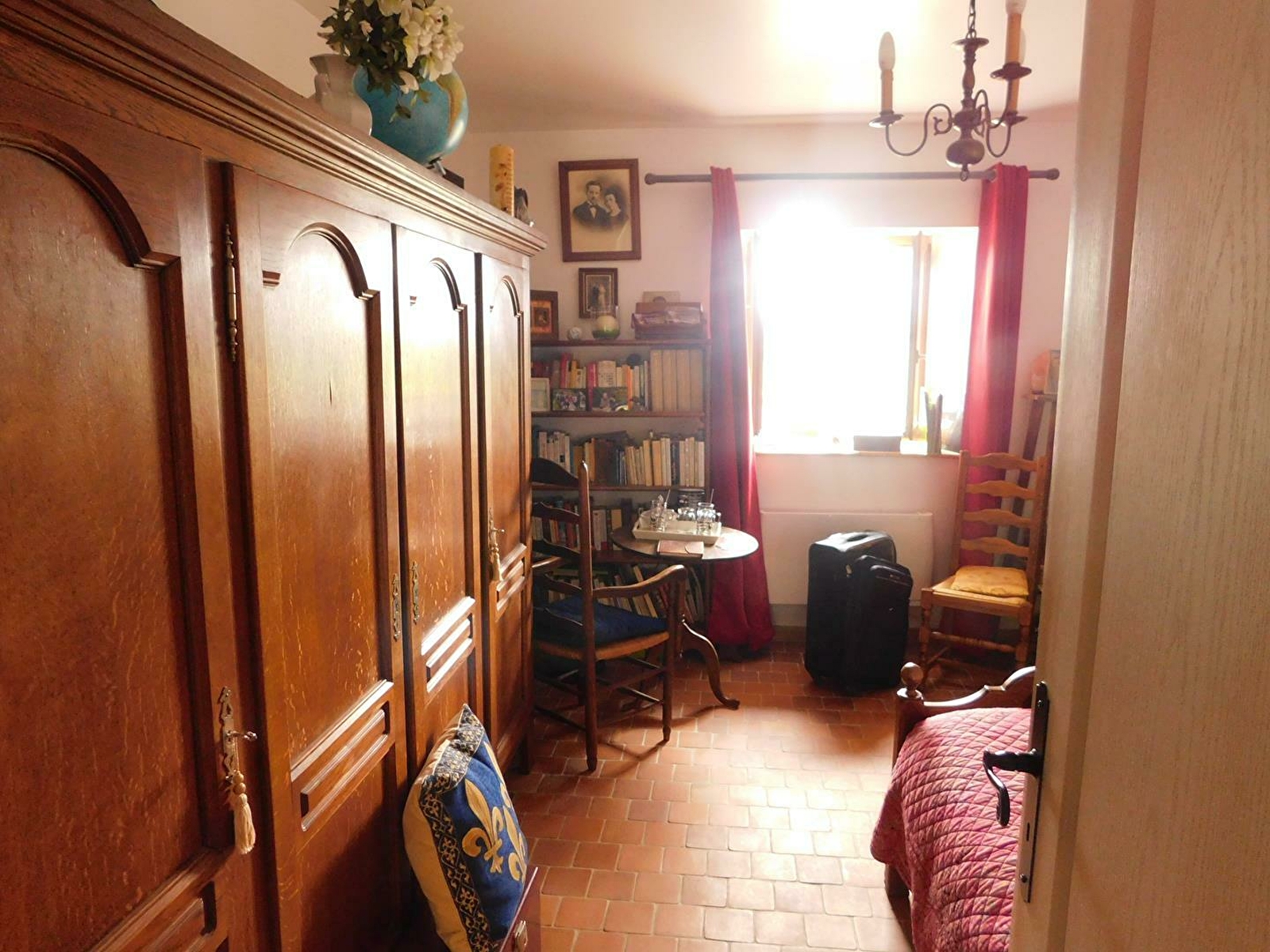 Une grande chambre de 20m² disposant d'un coin tv, d'une bibliothèque (où vous retrouverez le livre racontant l'histoire de cette chambre d'hôte), d'un bureau et d'un accueil boissons (chaudes ou froides). La salle de bain avec douche italienne offre une accessibilité à tous.