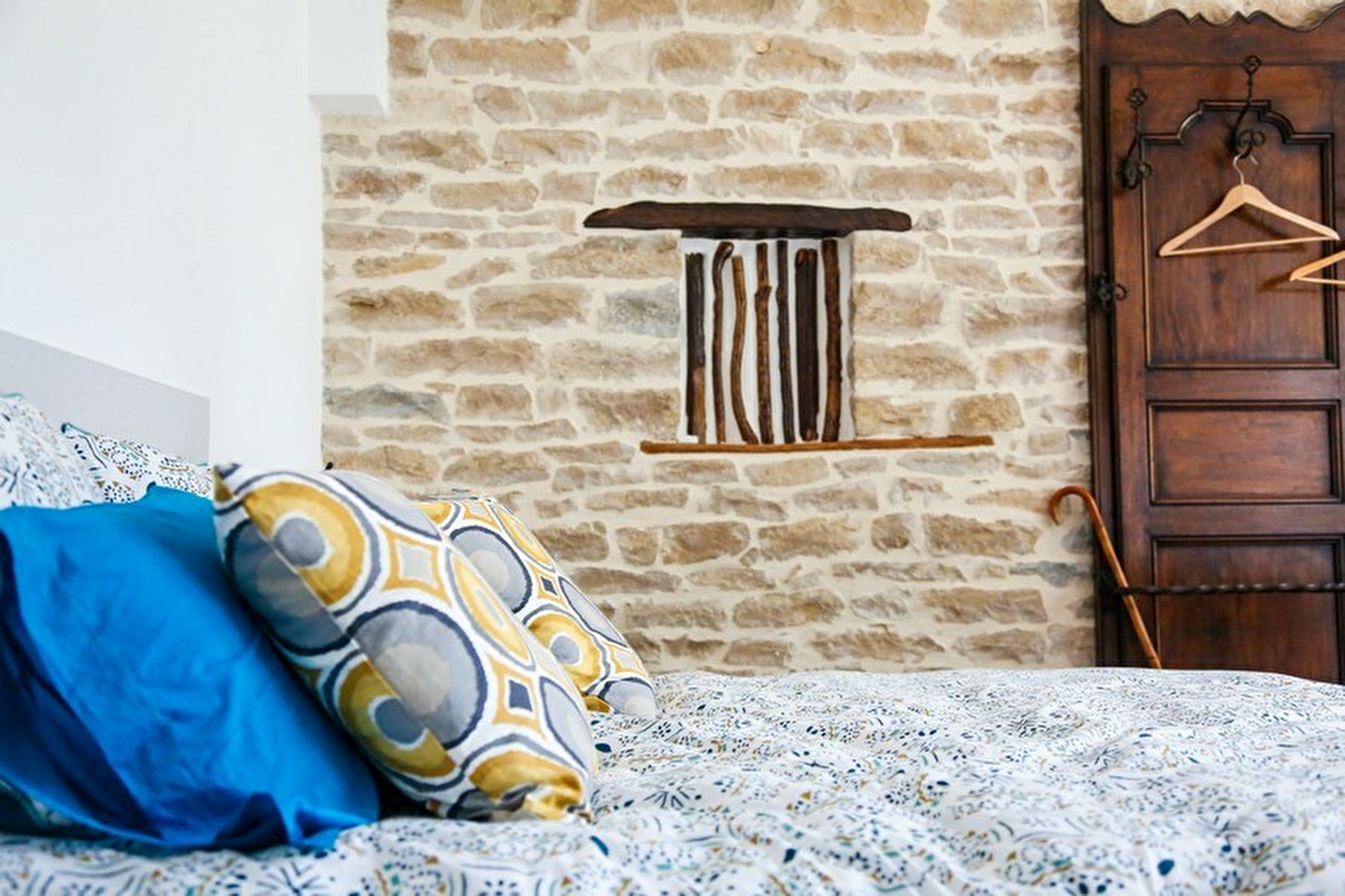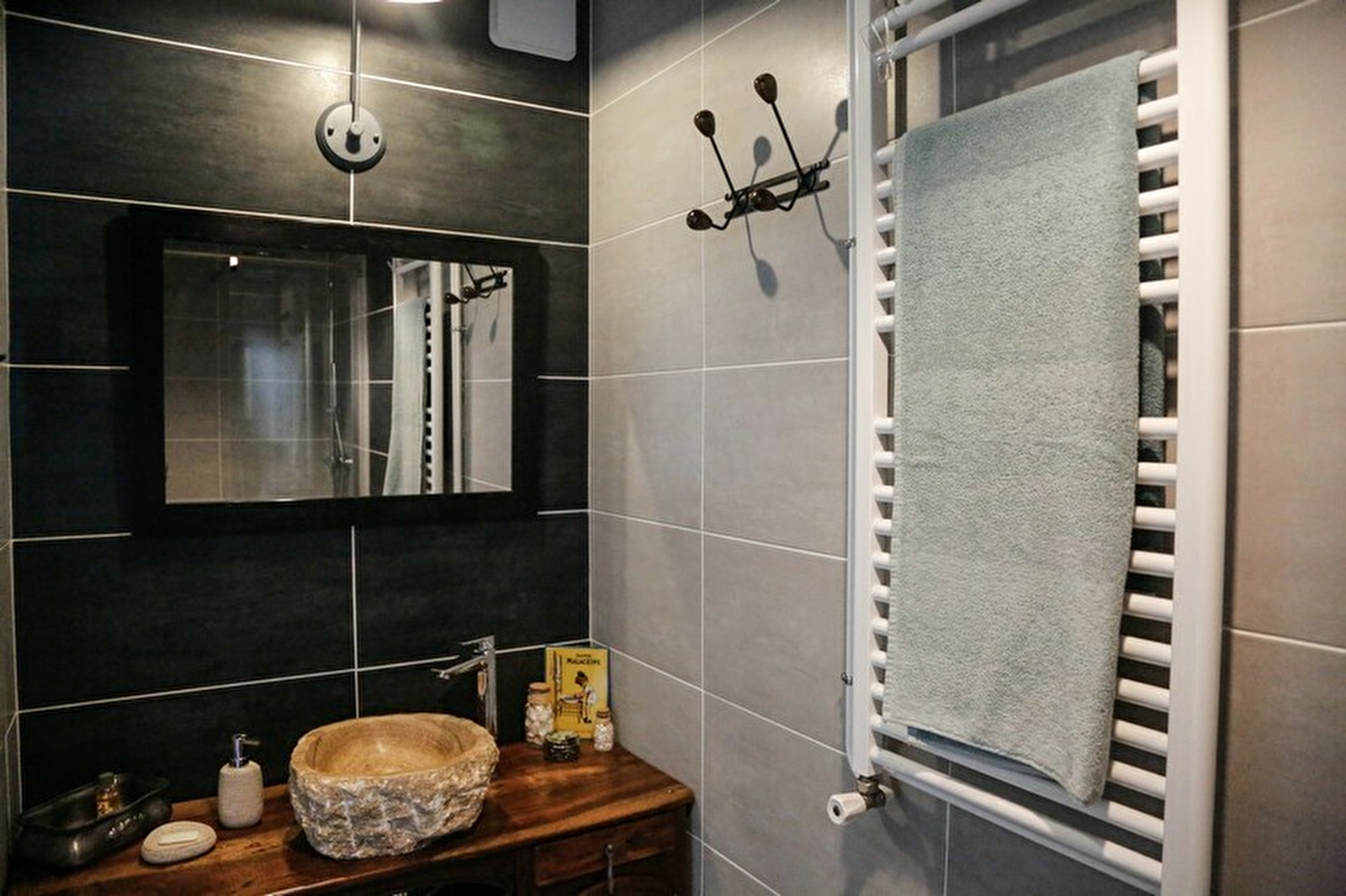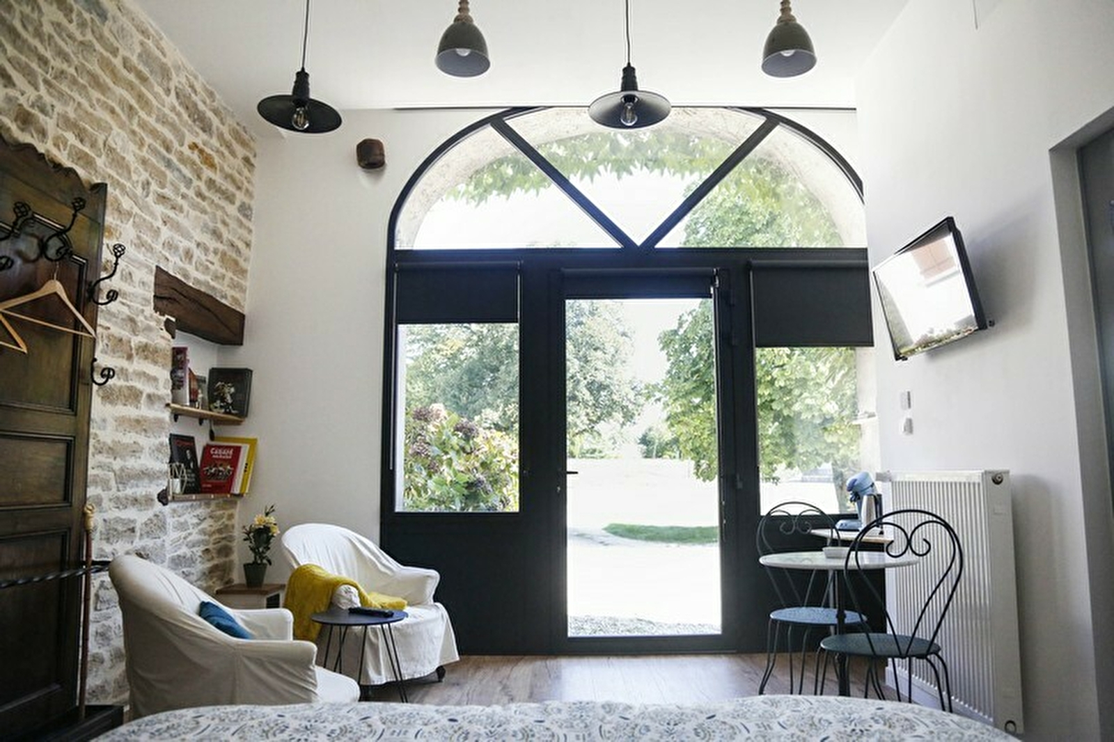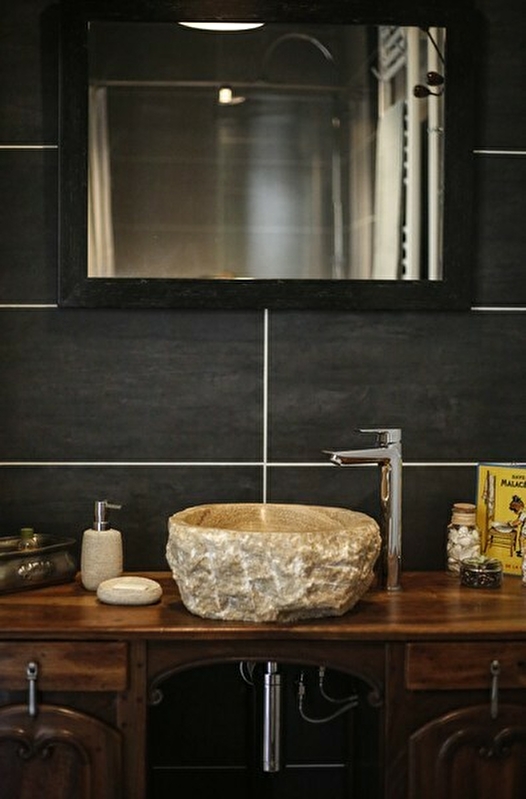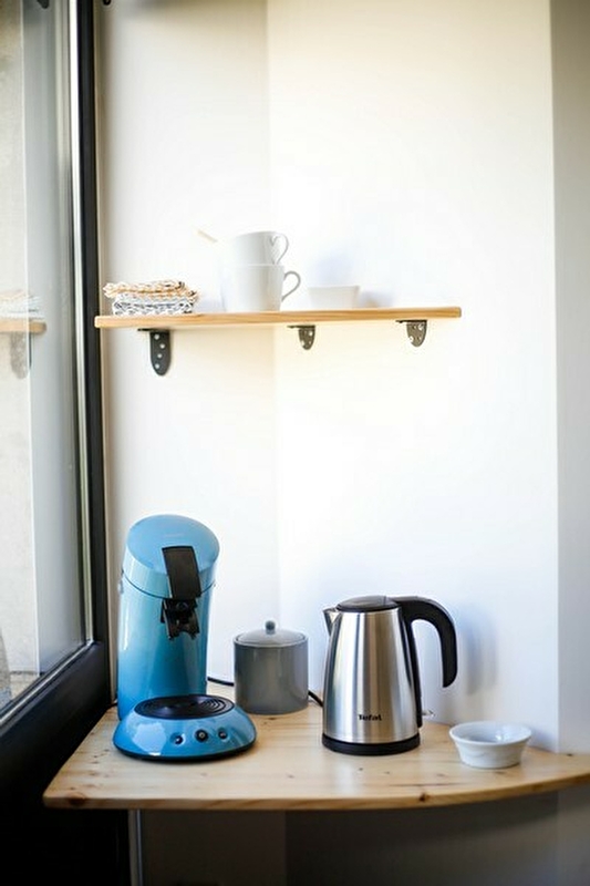 Chambre de 20 m² avec un lit 160x200, un coin salon avec TV écran plat (TNT) et WiFi, un espace accueil café, thé (cafetière, bouilloire), une penderie, ainsi qu'une salle d'eau privative attenante (douche à l’italienne, vasque en pierre, sèche serviettes). Les serviettes et linge de maison sont fournis ainsi que savon et shampoing.
