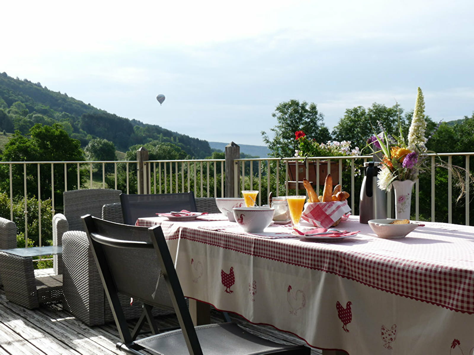 Aux beaux jours, le petit déjeuner servi en terrasse est composé de produits locaux et de fruits du jardin (en saison).