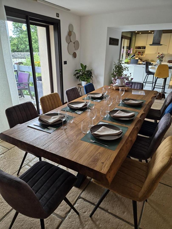 C'est avec grand plaisir que Marielle et Flo vous accueilleront Au Lavoir Du Serein au cœur du Jura dans un cadre calme et apaisant, doté d'un jardin où longe la rivière du Serein. Vous pourrez vous prélasser dans le jacuzzi, profiter d'une découverte des vins du Jura à travers une dégustation et enfin passer à table où Marielle vous préparera un repas constitué de plats fait maison et élaboré à partir de produits régionaux et de saison. Une parfaite occasion de découvrir les saveurs du Jura dans une ambiance conviviale et chaleureuse. Au matin, vous pourrez déguster un bon petit-déjeuner composé de produits de notre région, de gâteaux et de confitures, le tout fait maison. Que vous soyez un particulier ou un professionnel, nous vous invitons à passer un séjour détente et relaxation. Vous aurez aussi la possibilité d'explorer les environs (vignobles, cascades, lacs, etc.) avec des vélos électriques et profiter du pique- nique proposé pour passer un agréable séjour. La maison d'hôtes est constituée de 3 chambres : -La Billaude et l'Eventail, 2 chambres familiales pouvant accueillir chacune de 2 à 4 personnes avec 1 lit double (160*200) et 2 lits simples gigognes (80*200), une salle d'eau fermée par un rideau avec douche et WC -La Langouette : chambre double avec 1 lit 160*200 et salle d'eau fermée par un rideau avec douche et WC Vous pourrez profiter des espaces communs : bibliothèque, salon, billard, jacuzzi, ping-pong, terrain de pétanque, grand jardin en bordure de rivière (accès non protégé) Garage possible pour vélos, motos et autos. Prise électrique renforcée permettant la charge de voitures électriques (en sus). La table d'hôte est également proposée aux personnes extérieurs sur réservation.