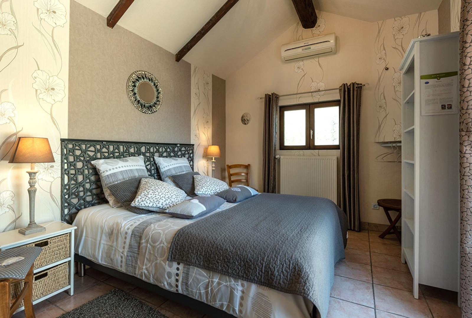 Composition : Chambre totalement indépendante (accès) au rdc d’une aile de la maison. Wifi (fibre). Chauffage PAC. Climatisation. TV dans la chambre. Chambre (lit 2 p. 160x200cm) avec salle d’eau privative (douche/Wc) + pièce de vie privative attenante accessible par extérieur (espace repas & détente + cuisine complète avec micro-ondes, four, réfrigérateur et plaques électriques). Terrasse + jardinet clos + parking privés. Local vélos. Toutes commodités dont restaurants 6.5 km. Supermarché 5.5 km.