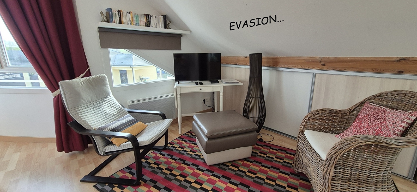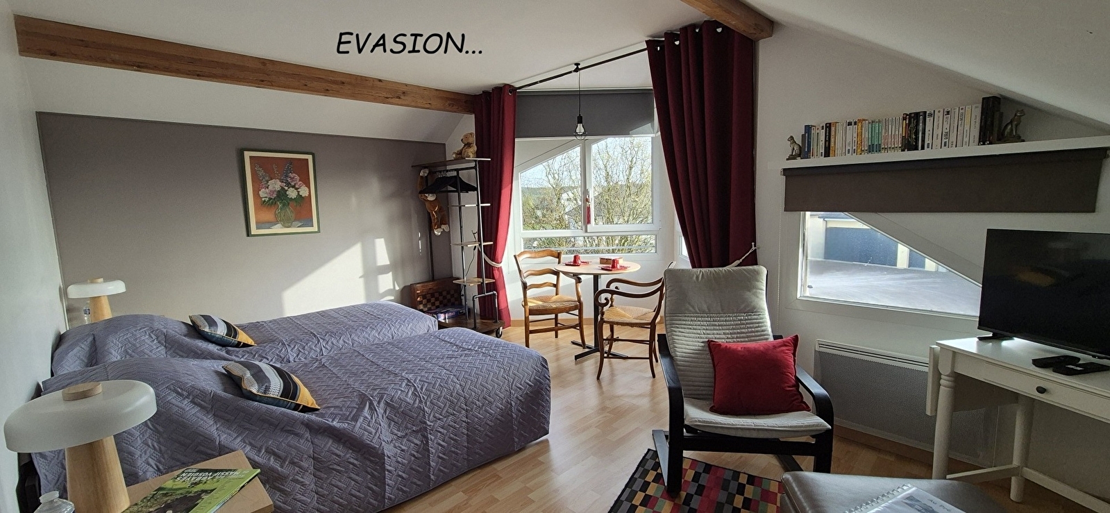 Côté village, chambre «VOYAGE», équipée d'un lit double 160 x 200, coin bureau, bouilloire, TV et penderie.