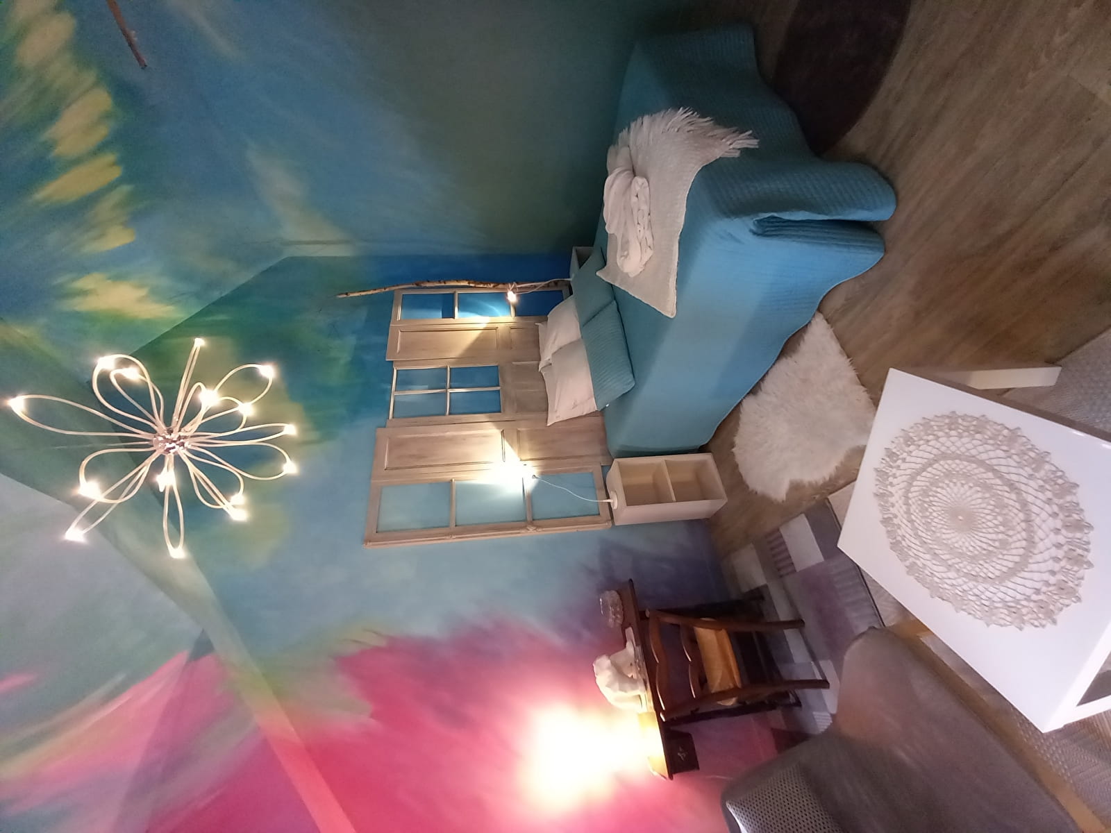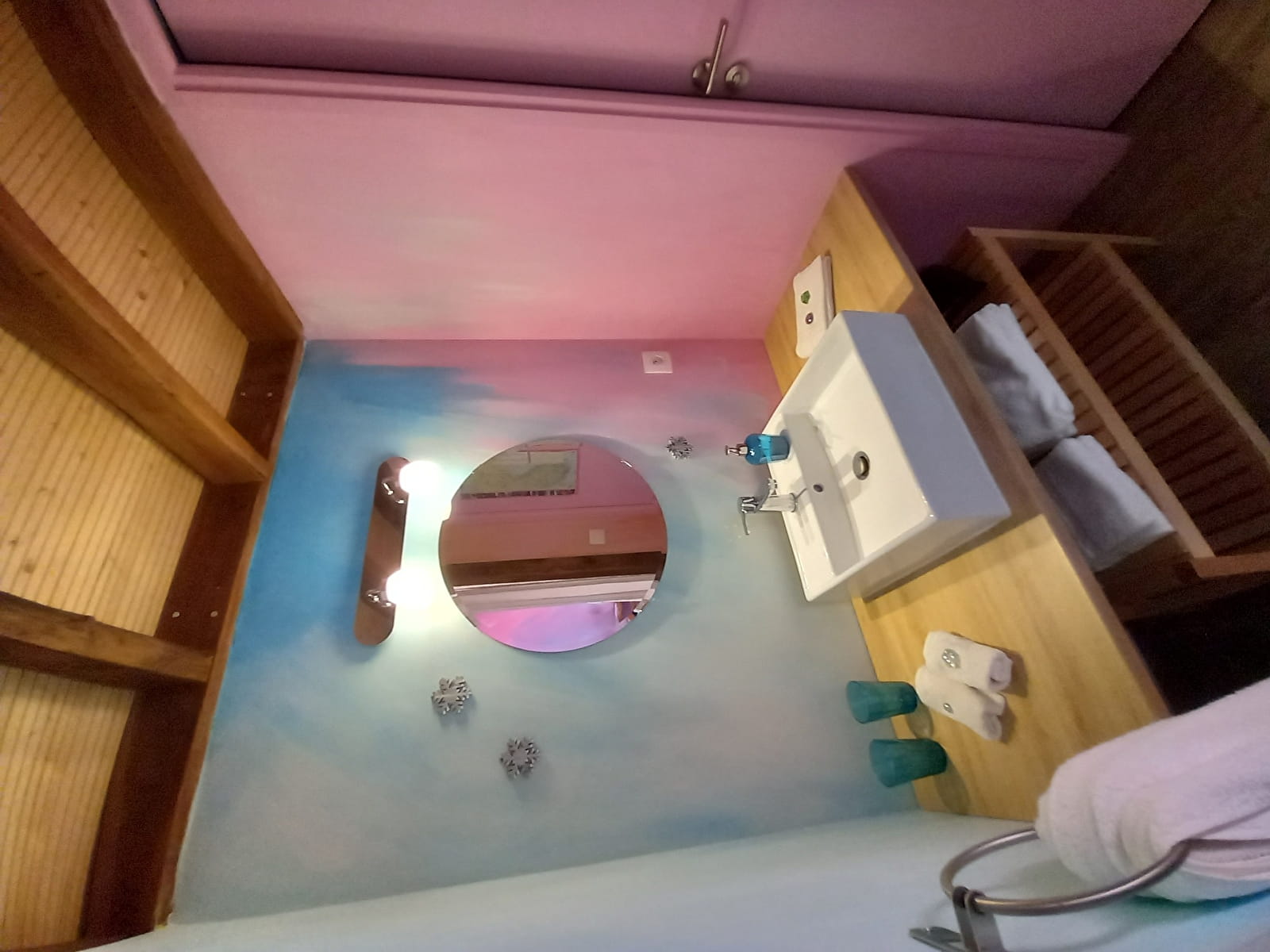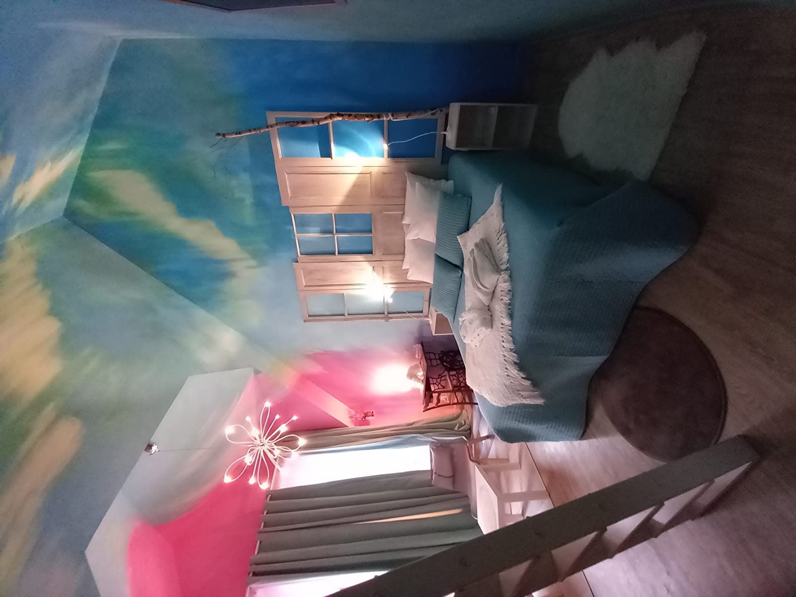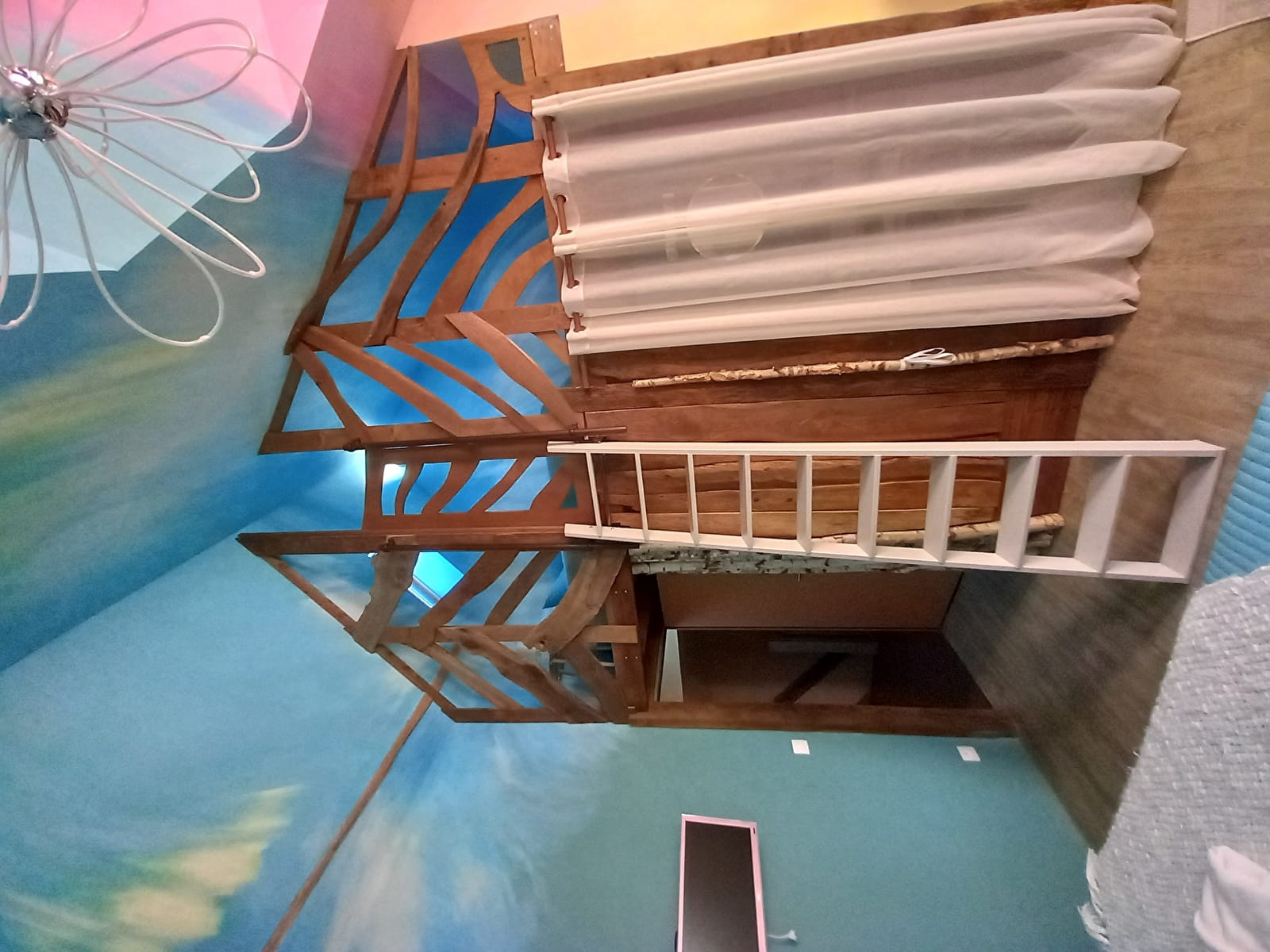 Chambre Aurore boréale : 2 à 3 personnes avec un lit double et un lit simple en mezzanine, située au 1er étage avec vue sur le jardin