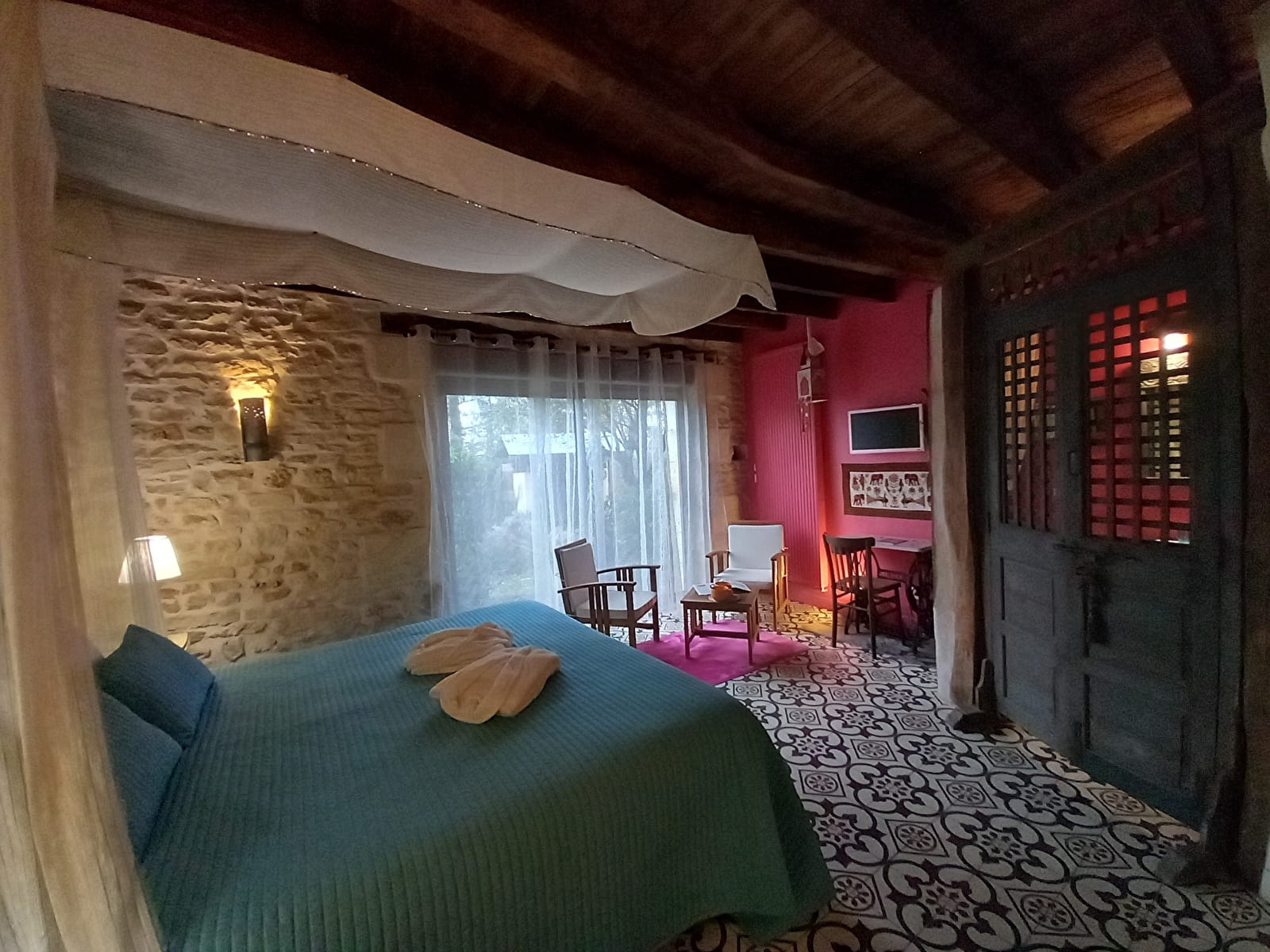 Chambre Descente du Gange : 2 personnes avec un lit double, située en rez-de jardin, avec une terrasse privée et un accès direct au jardin