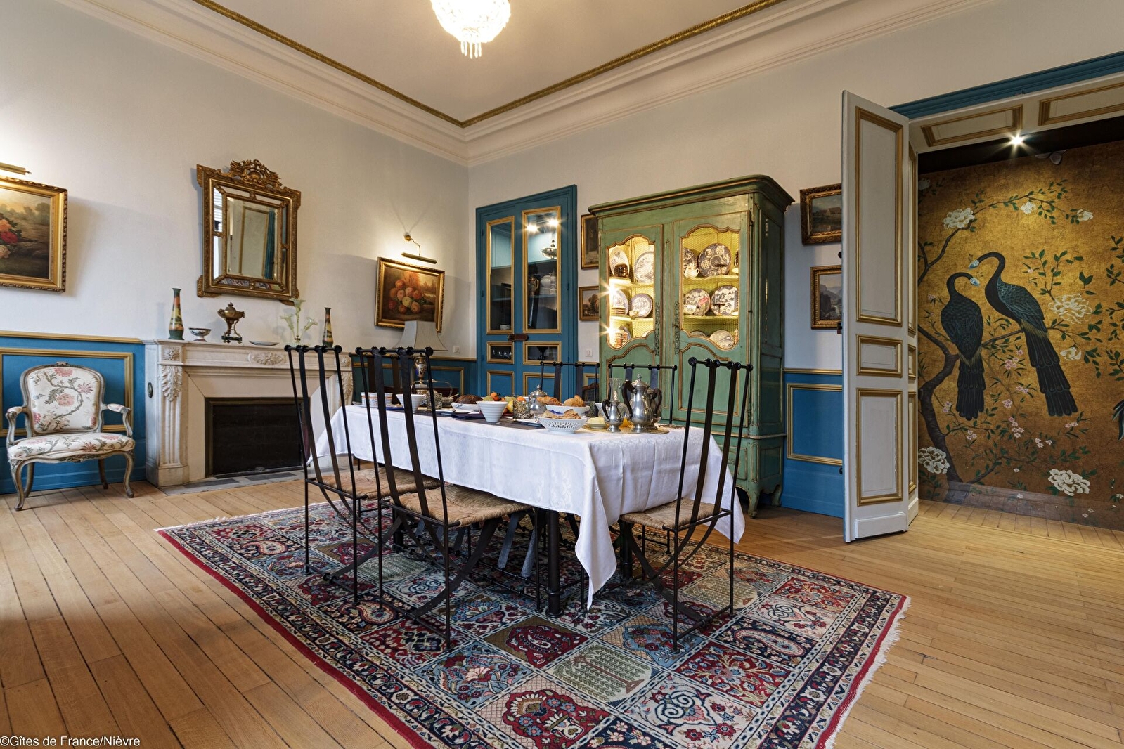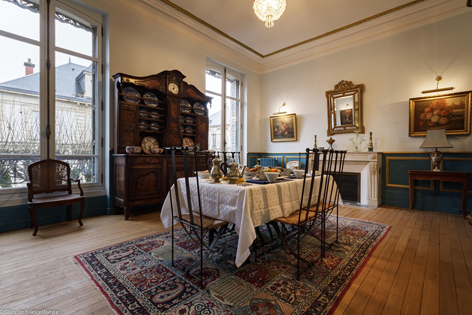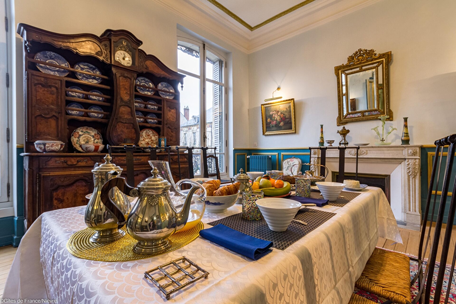 Dans le centre-ville de Nevers, dépaysement garanti grâce aux propriétaires qui après avoir vécu de nombreuses années en Asie et réalisés de nombreux voyages, ont ramené des pièces de collection afin de thématiser chaque chambre et vous faire vivre une expérience : Au 2ème étage vous accueille la chambre Amérique composée d'une chambre Art Déco avec 1 lit 140x190 pour 2 personnes,salle de bain (baignoire); au 3ème étage, la chambre Afrique avec son lit 160x200 et sa salle d'eau; la chambre chinoise où vous dormirez dans un authentique lit chinois de mariés (dimension 135x190) et sa salle d'eau; la chambre japonaise où vous pourrez dormir sur de véritables tatamis sur lequel repose le futon (120x190) et sa salle d'eau, le couchage est donc au niveau du sol sur les tatamis et le futon comme au Japon. Egalement au 3ème étage, un espace détente avec télé, et la kitchenette. Le petit-déjeuner se prendra au 1er étage dans la salle à manger ou sur la grande terrasse par beau temps. Stationnement dans la rue et 1 place devant la maison. Abri fermé pour vélos.