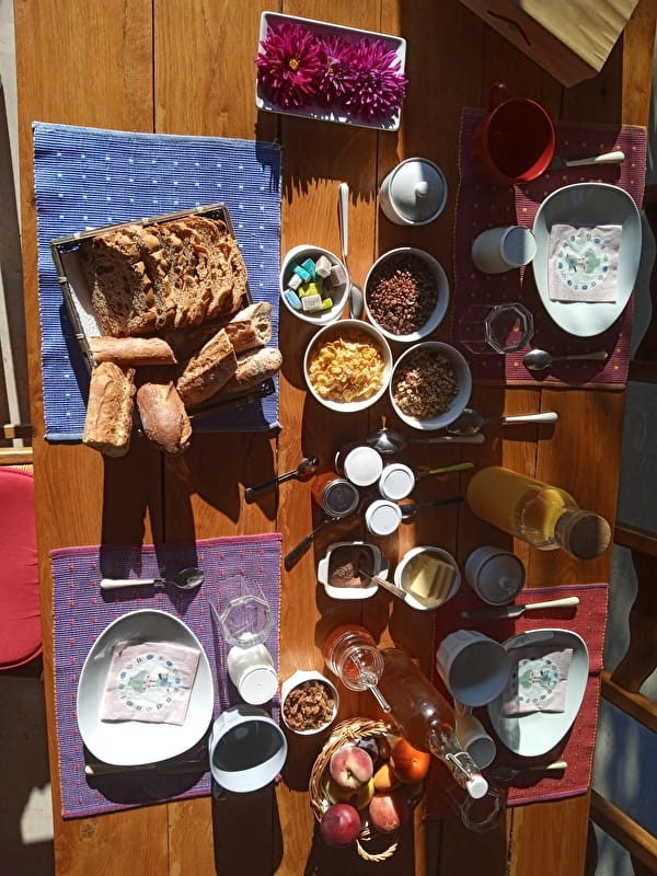 Un petit-déjeuner copieux constitué le plus possible de produits maison ( 10€ par personne) sera servi sur demande soit dans la grande salle à manger, soit sur la terrasse recouverte d'une glycine surplombant le jardin verdoyant où les enfants trouveront des jeux.