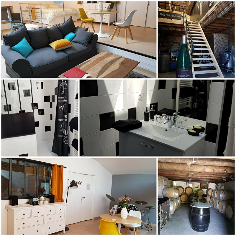 Dans un domaine viticole de Bourgogne du Sud, chambre d'hôtes avec entrée atypique indépendante par le cuvage, un grand loft de 70 m², sous rampant avec poutres apparentes... Un espace chaleureux, tout confort....