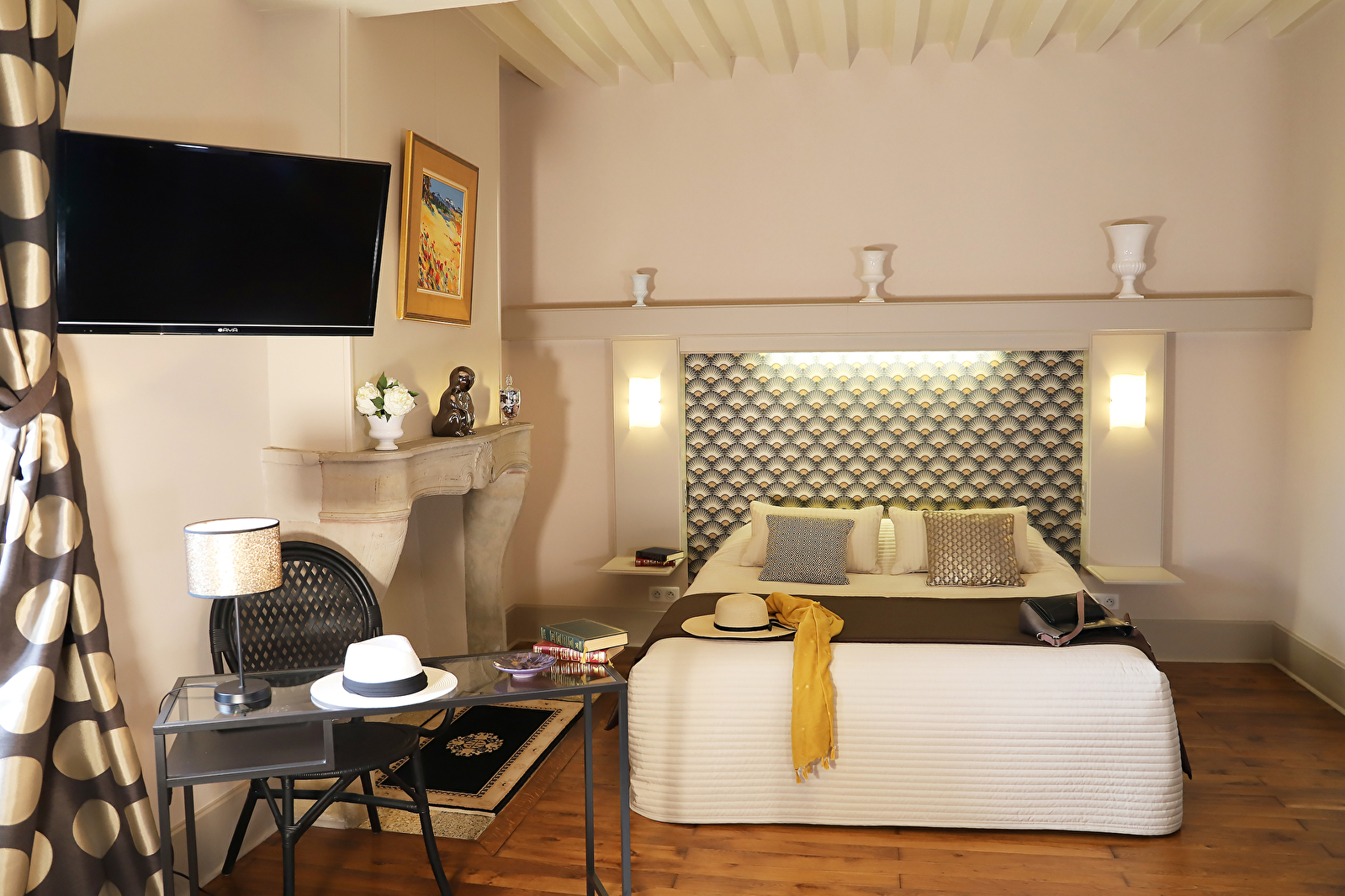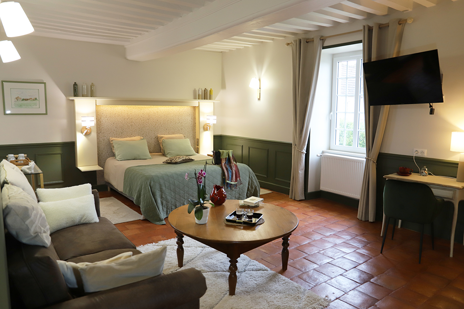 La suite "Sarah" (43m2) avec salon et lit de 180, TV, salle d'eau avec douche à l'italienne et WC séparés.