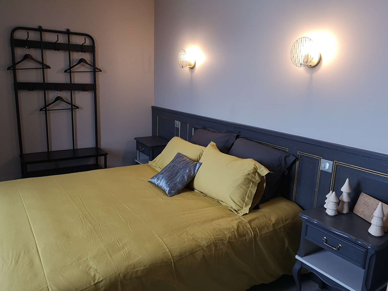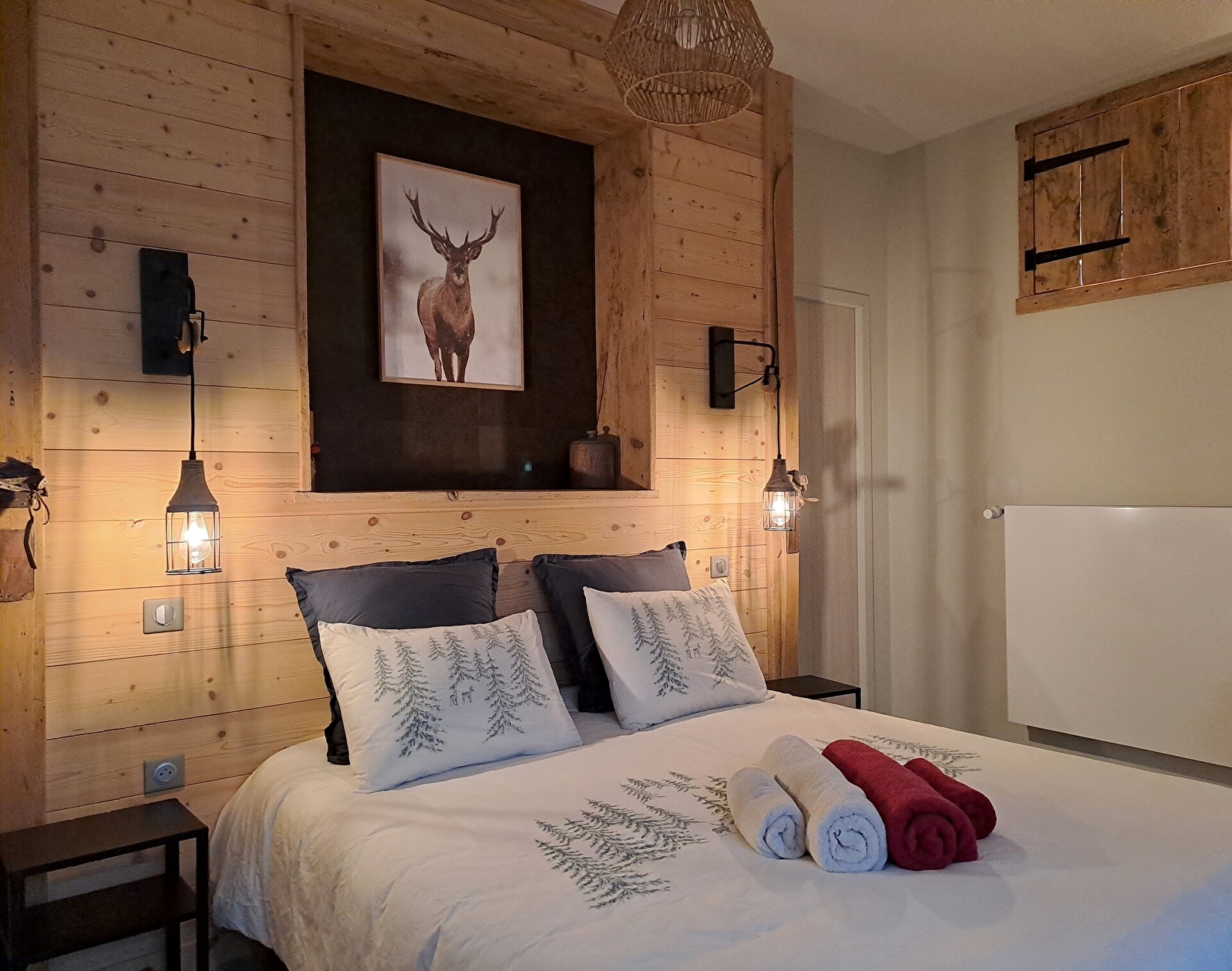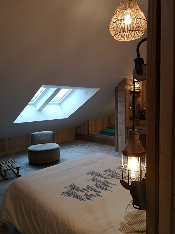 Cette grande chambre est située sous les toits pour retrouver l'ambiance de nos montagnes. Venez vous mettre au chaud dans une ambiance chaleureuse.