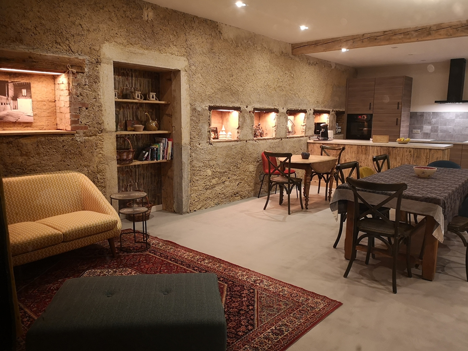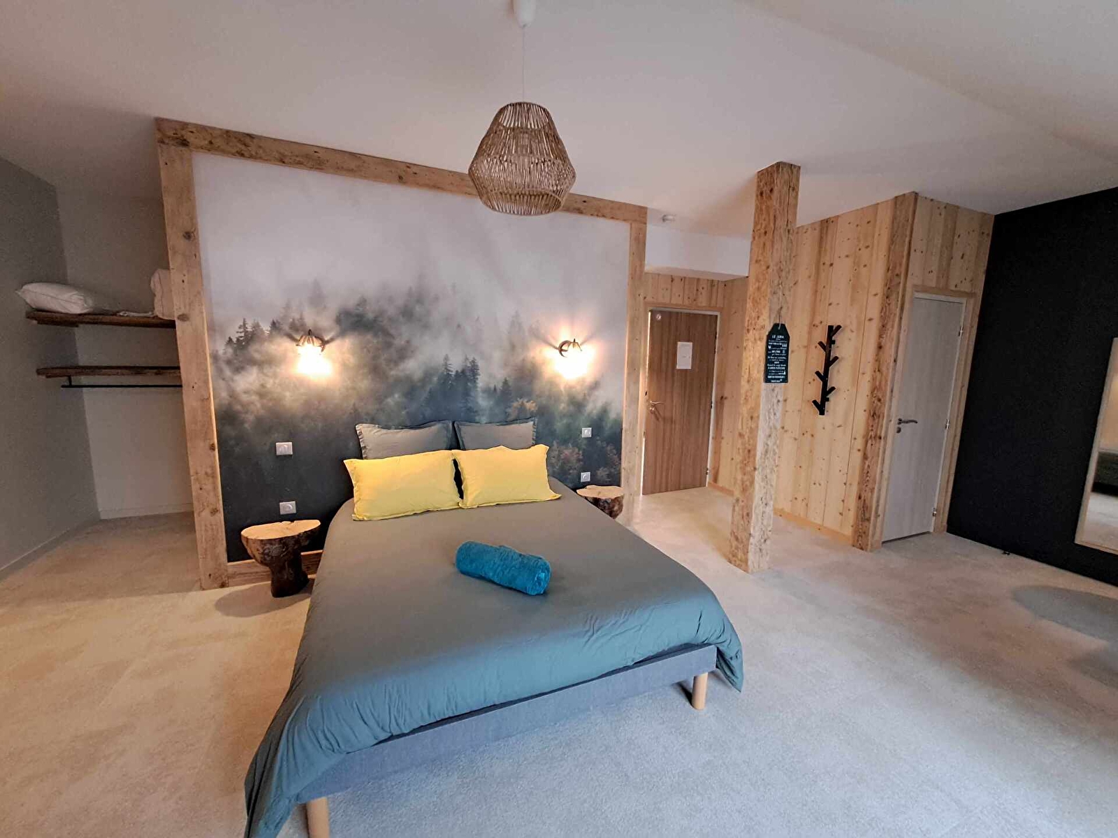 La chambre "Grumes et brouillard" de 55m2 pour 4 personnes (2 adultes et 2 enfants) est composé d'un lit double et d'un canapé convertible. Cette grande chambre sous les toits vous transporte au cœur des belles forêts jurassiennes. Dormez entre les sapins présidents et des épicéas géants.