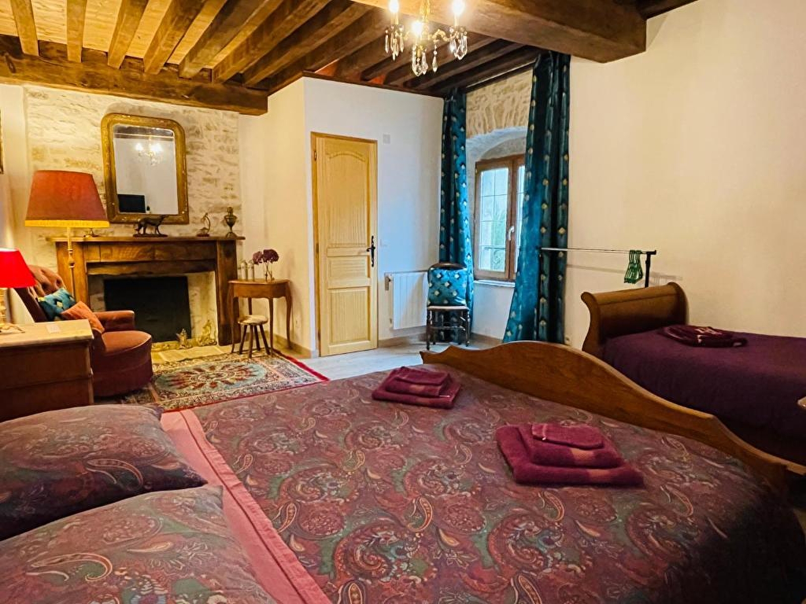 Ont été aménagées au 2ème étage, sous la charpente en chêne, 2 chambres doubles (avec possibilité de les jumeler) et 1 chambre simple, décorées avec soin et meublées à l’ancienne ; et au 1er étage d’une aile du XVIe siècle, 2 autres chambres doubles.