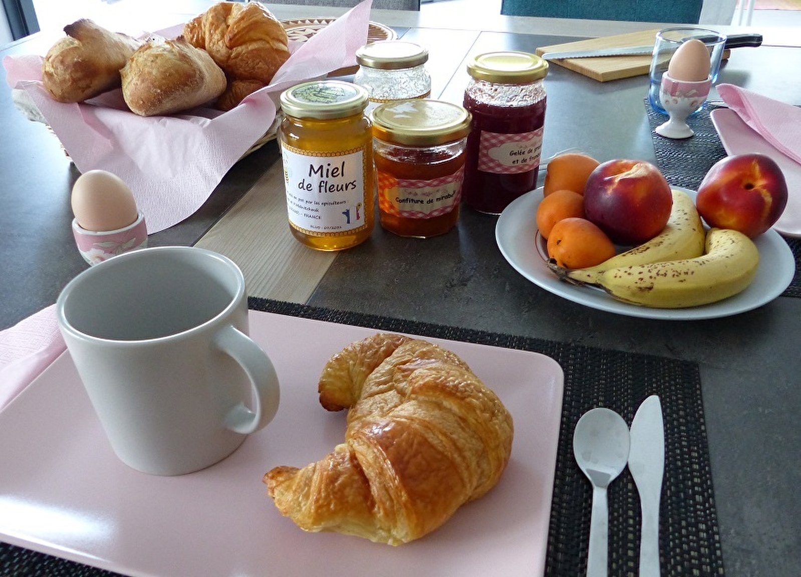 Un petit déjeuner copieux avec des produits maison : confitures et yaourts, miel de nos ruches, œuf de nos poules, jus de pomme… Il vous sera servi sur la terrasse ou dans la pièce de vie.