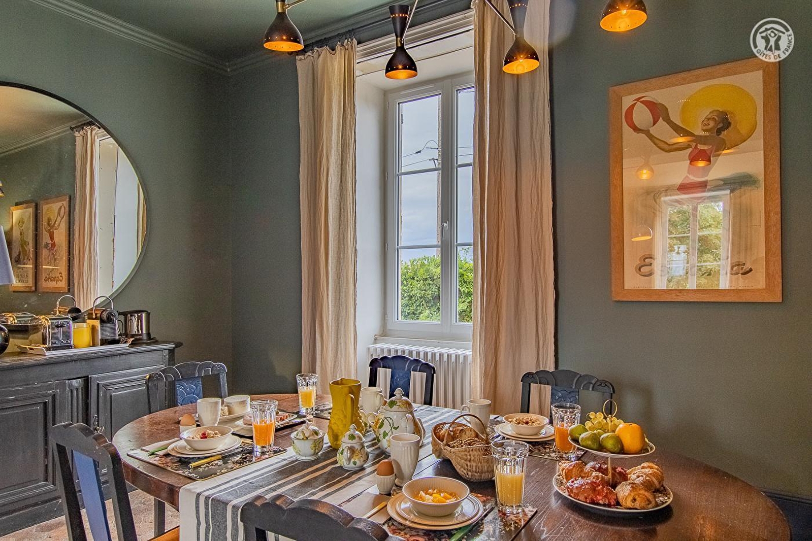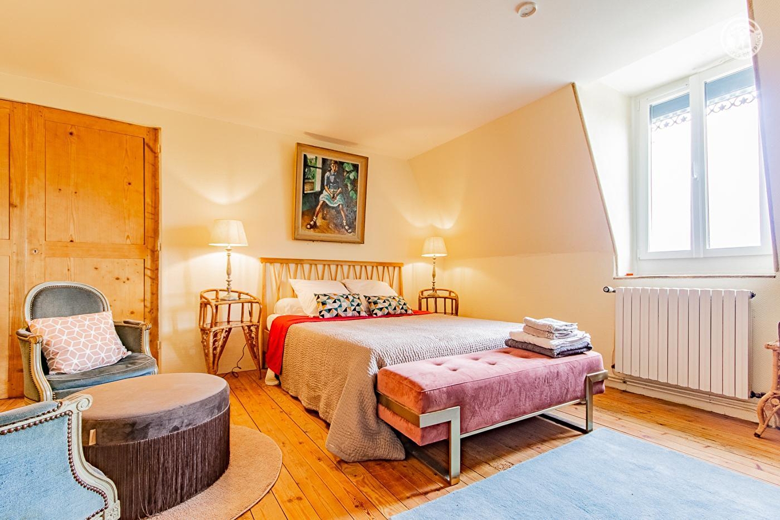 Composition : Suite familiale totalement indépendante (1er étage intégralement privatisé). Petits déjeuners servis dans le salon-séjour des propriétaires au rdc (avec cheminée). Wifi. Chauffage central fioul. 2 chambres indépendantes communicantes par couloir (lit 2 p. 160x200cm / lit 2 p. 140x190cm) dont 1 avec sde privative (douche multi-jets). Salle de bain (baignoire + douche) + Wc indépendant privatifs sur pallier (couloir). Salon de détente privatif en mezzanine palière. Parking privé. Local vélos. Jardin en commun avec piscine chauffée (12x3m), terrasse couverte et terrain de pétanque. Supérette 2.5 km. Restaurants & commodités 12 km.