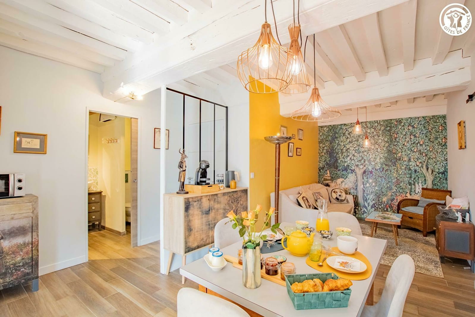 Composition : Suite totalement indépendante au 1er étage de la maison des propriétaires. Wifi (fibre) + TV. Chauffage central gaz. Comprenant : pièce de vie (espace détente & repas) + chambre (lit électrique 2 p. 140x190cm) + salle d'eau privative (douche/Wc). Micro-ondes à disposition. "Panier repas" sur demande. Petit déjeuner servi dans la chambre. Balcon véranda abrité + terrasse sur cour + parking privés. Jardin clos (2000m²) en commun. Local vélos. Commerces 1.5 km. Supermarché 3 km. Restaurant 5 km.