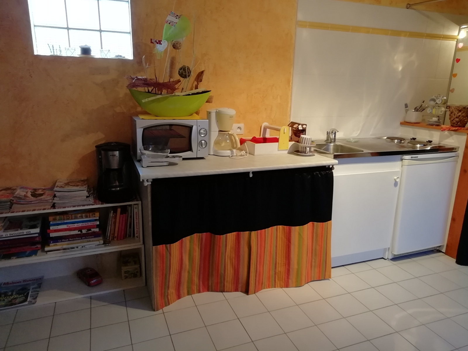 RDC : cuisine (frigo, plaques, four mc...) + wc et douche/lavabo