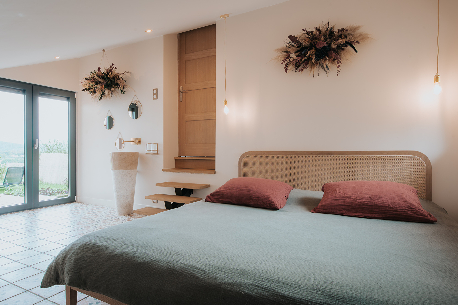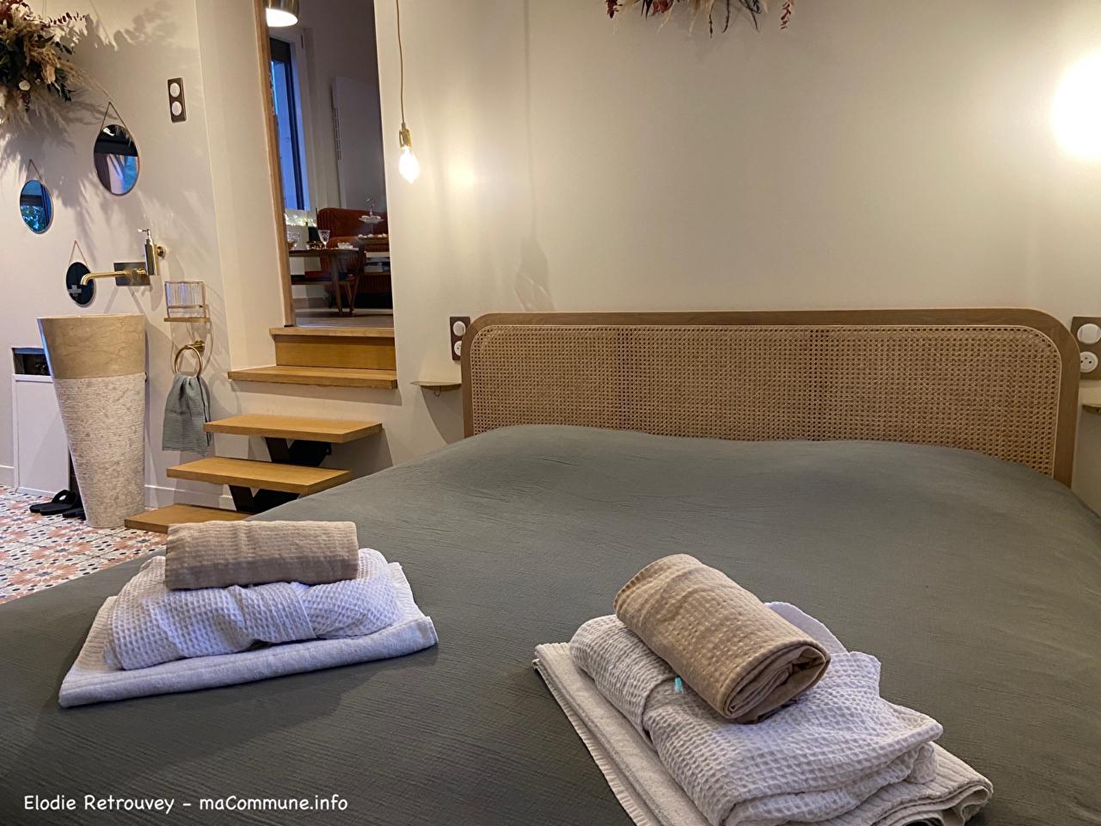 La chambre d’hôtes, chaleureuse et soigneusement aménagée, invite à une escapade inoubliable, entre confort et sérénité. En été, la piscine extérieure et les transats complètent parfaitement ce moment de pause.