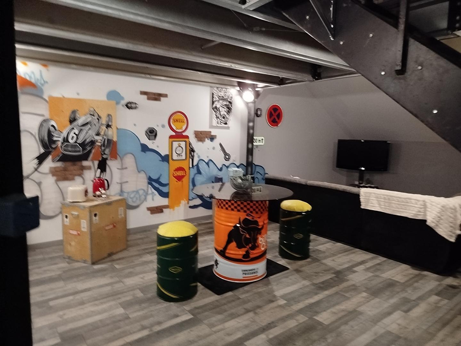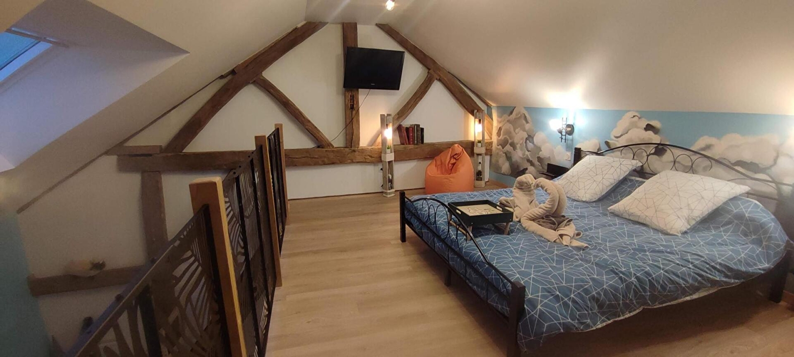 Belle bâtisse au pied du Château de Mutigney, petit village paisible situé à 2 kilomètres de Pesmes (classé plus beaux villages de France) sur l'axe reliant Besançon à Dijon et Gray à Dole, région culturelle et historique de Franche-Comté. L'aéroport de Dole-Jura est implanté à 30km. Stéphane et Virginie ont aménagés 2 chambres thématisées : la Shaun room de 70 m2 et la Street room de 60 m². Elles sont aménagées d'un séjour avec TV, d'un coin repas pour vos petits déjeuners et dîners en tête à tête. Vous avez également à disposition tout le nécessaire pour vous préparer un thé, un café ou une infusion. La Shaun room dispose d'un lit king size 180*200 en mezzanine accessible par un escalier à pas japonais et d'une TV. La Street room dispose d'un lit double 160*200 en mezzanine. La salle de bain privée est équipée d'une douche à l'italienne, double vasques, une baignoire et un wc séparé. Un accès internet est disponible par le biais de la WIFI. Lit bébé sur demande. Équipements : Armoire / penderie - Sèche-cheveux - Linge de toilette et de lit inclus - Peignoirs Le propriétaire a sélectionné pour vous les meilleurs producteurs de notre région pour vous faire déguster des produits locaux (charcuteries, fromages, pain de campagne et vin). Le petit-déjeuner (inclus dans le séjour) est servi dans votre chambre ou dans le jardin selon la saison. Extérieur : mobilier de jardin (tables, chaises, transats, parasol ...), barbecue, parking privé et gratuit. Idéalement situé pour découvrir Pesmes, classé parmi les plus beaux villages de France, l'abbaye d'Acey ou encore la ville d'Art et d'histoire de Dole.