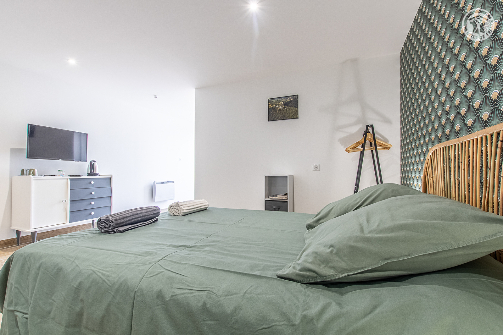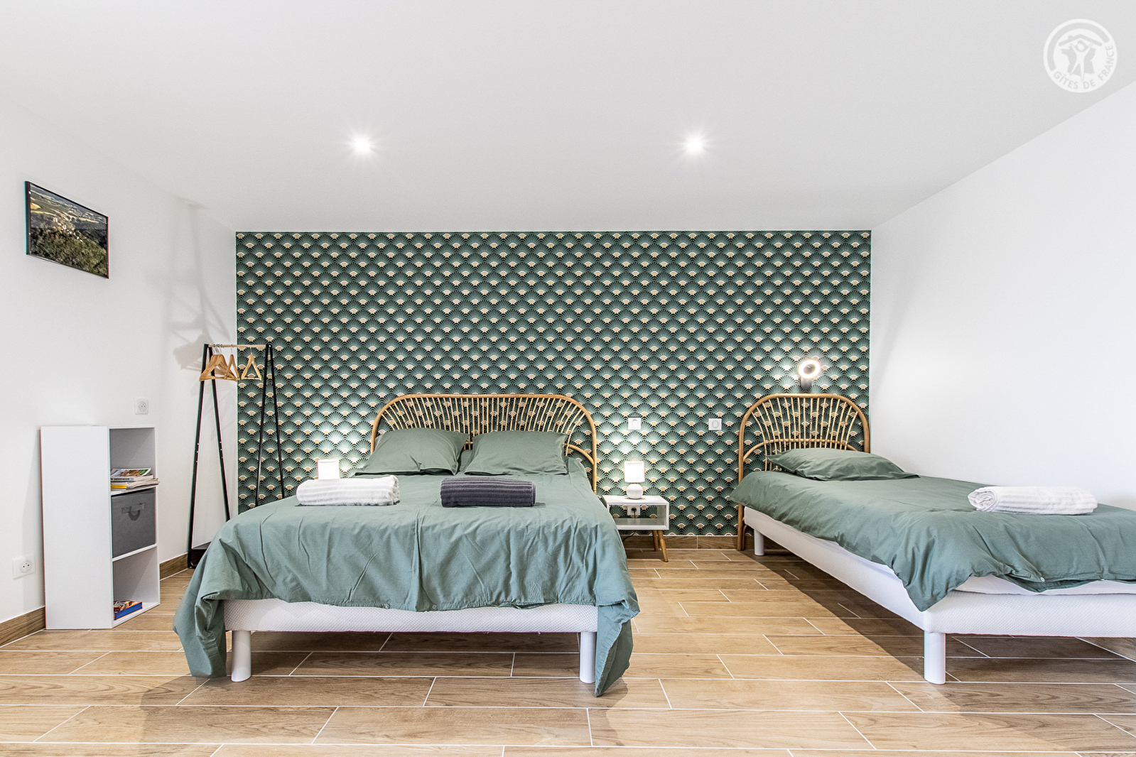 Composition : Annexe totalement indépendante jouxtant la maison des propriétaires. Wifi. Chauffage électrique. Chambres de plain-pied au rdc avec terrasse + TV + salle d'eau privative (douche/wc). Une chambre double au rdc de type "mini suite" avec coin salon (lit 2 p. en 160x200cm). Une chambre familiale (lit 2 p. en 140x190cm + 2 lits 1 p. de 90x190cm). Pièce de vie commune (micro-ondes & réfrigérateur-congélateur) + véranda pour les petits déjeuners aménagée dans la maison propriétaires. Terrain commun clos (cour + jardinet). Local vélos/motos. Parking privé. Commodités 4.5 km. Restaurant 4 km.
