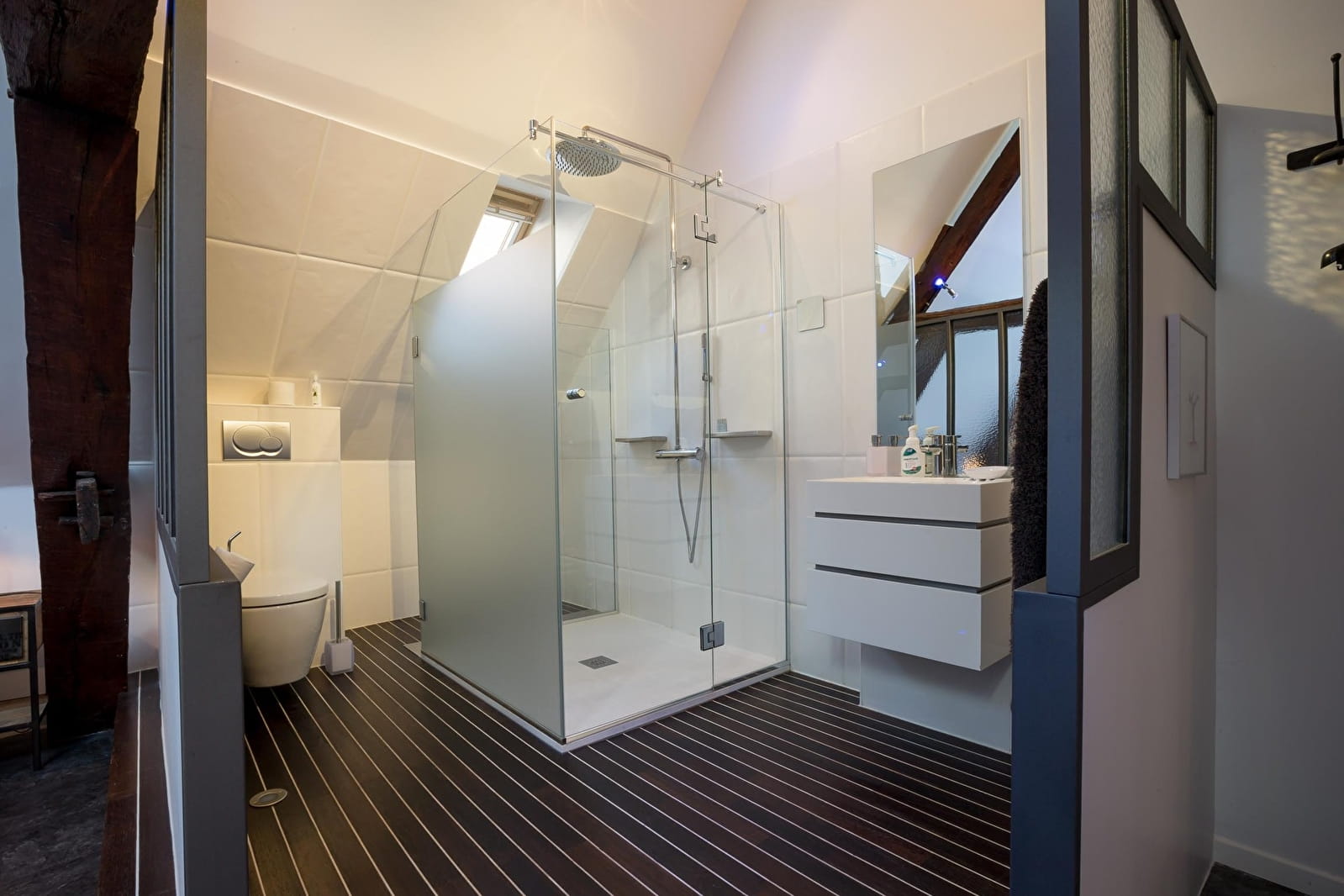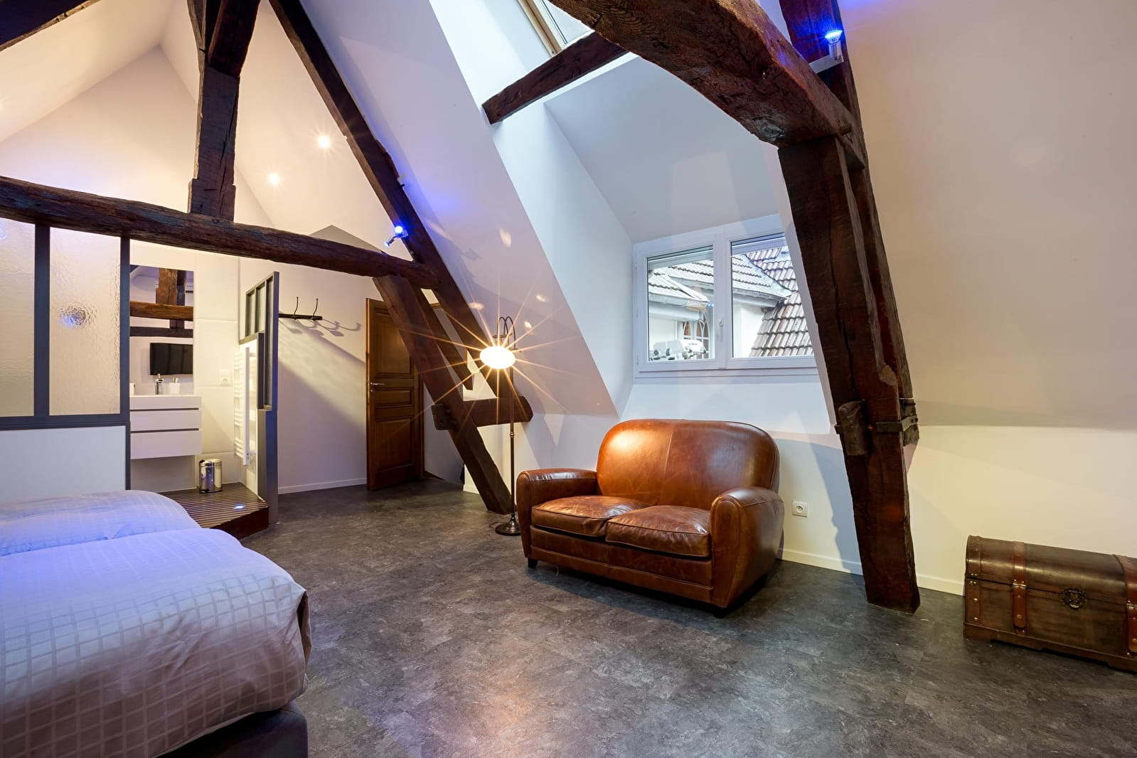 La maison de Maurice vous propose une belle chambre spacieuse « La Suite », climatisée, située au 2ème étage, avec une décoration contemporaine, un esprit cosy et chaleureux apporté par le charme des poutres apparentes.