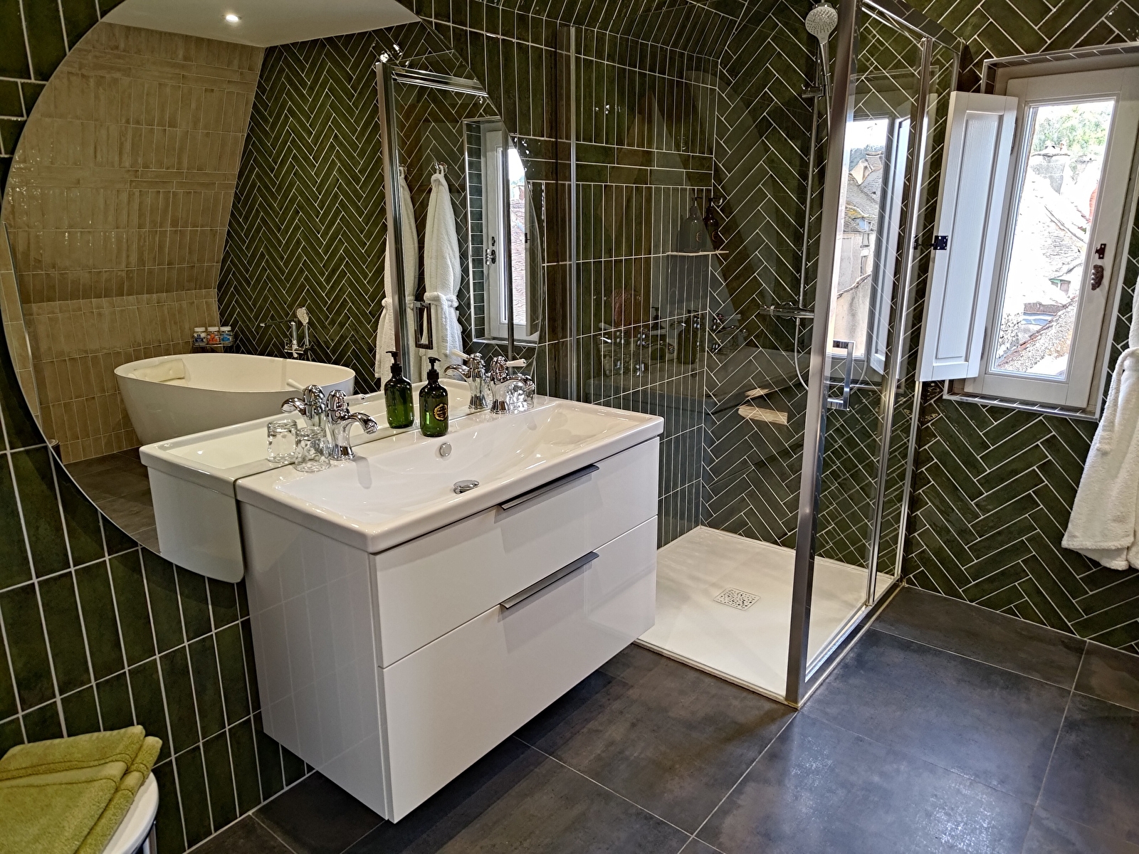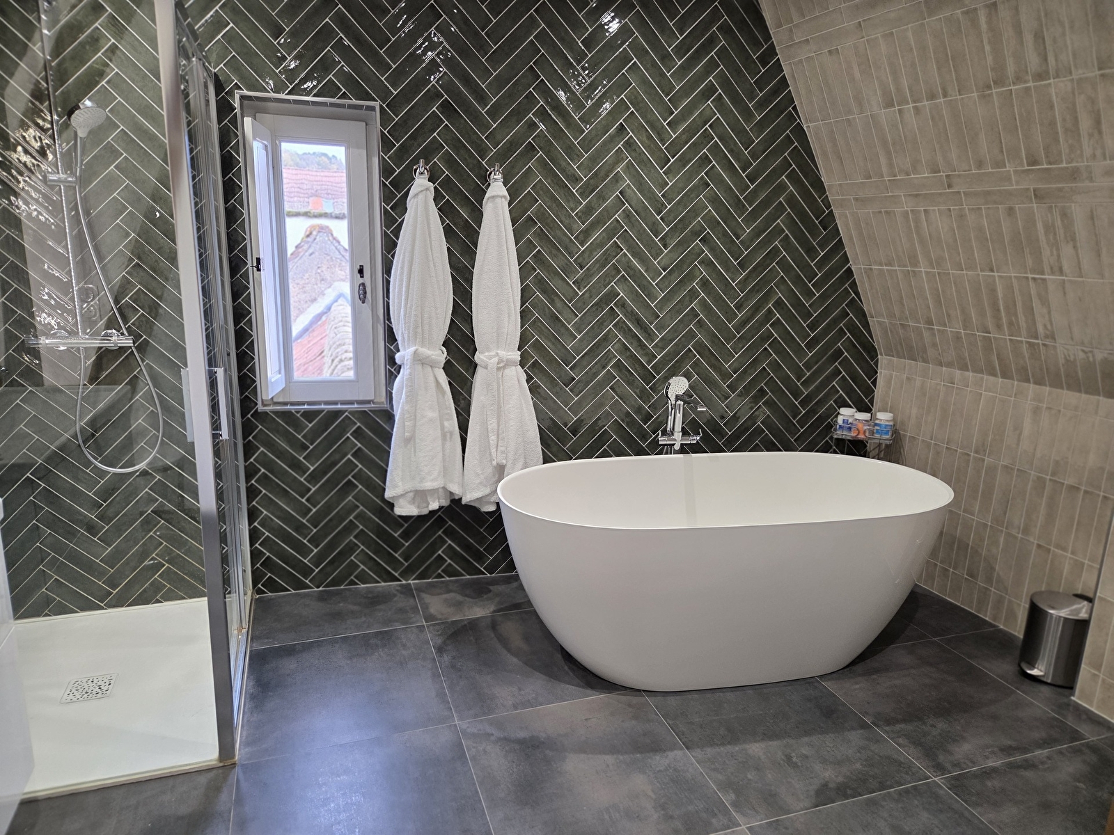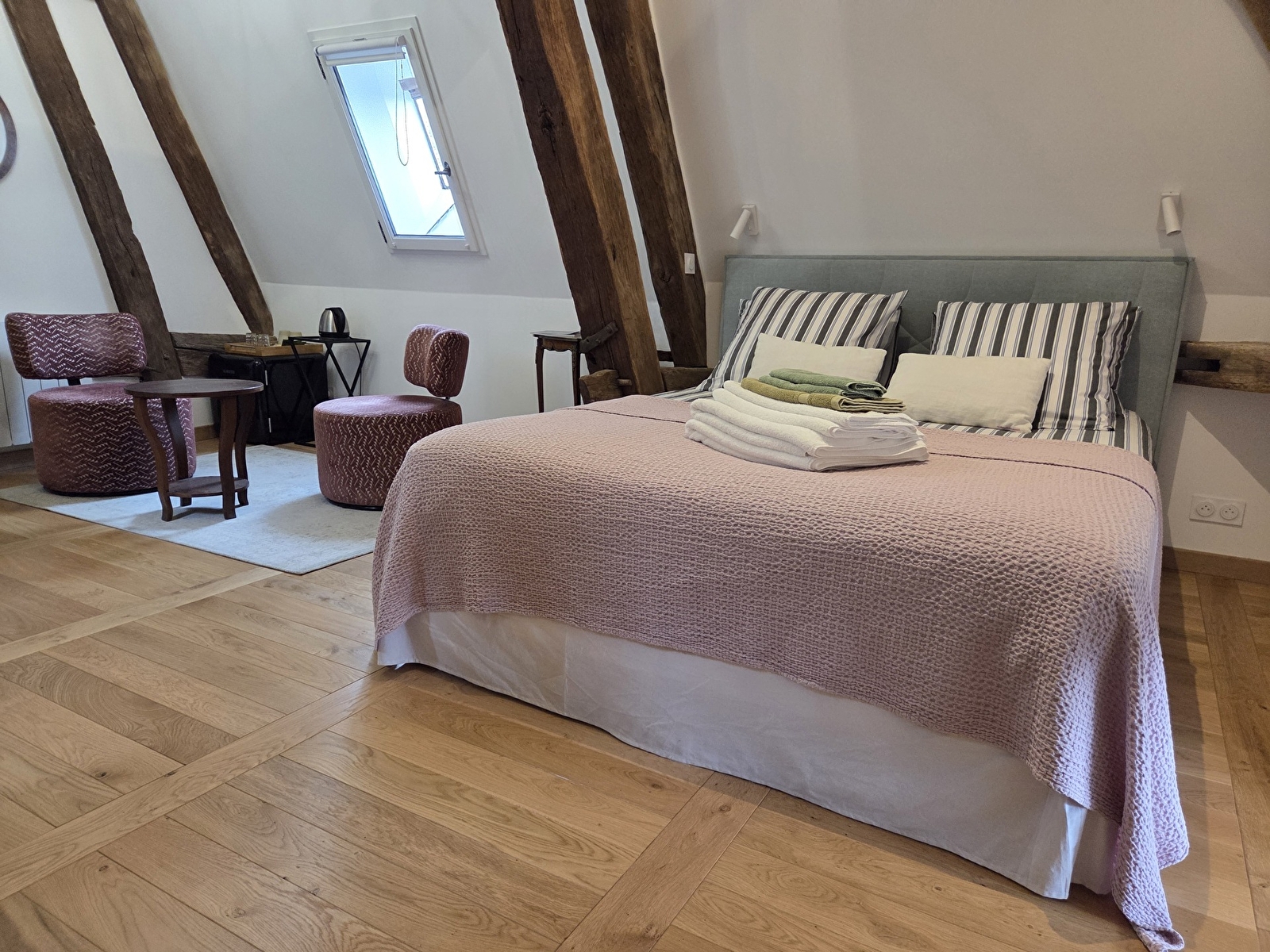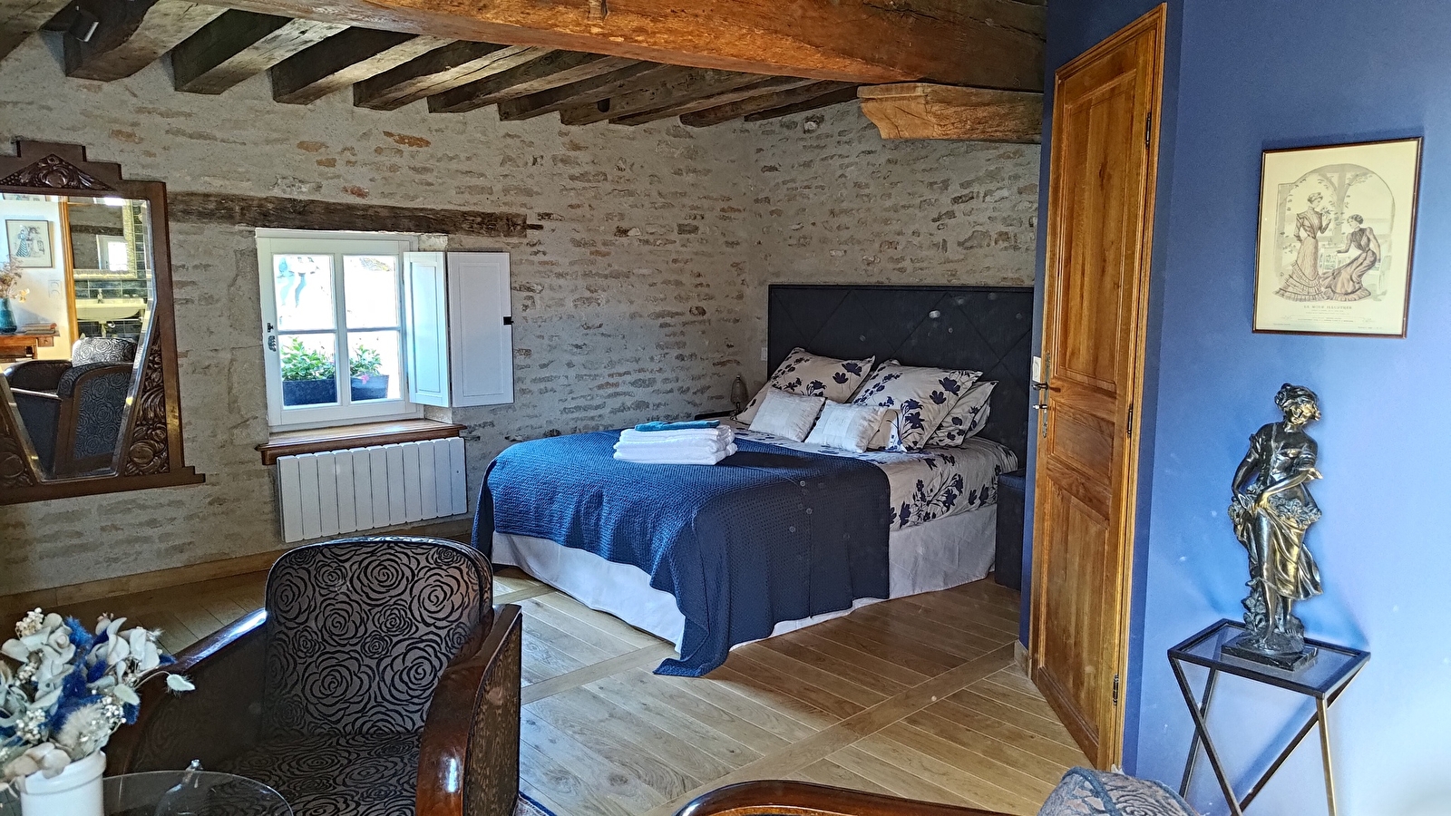 Nos trois chambres sont spacieuses et comprennent toutes une salle de bain privative et un salon. Elles sont équipées du linge de lit, des serviettes de qualité, des articles de toilette gratuits et d’un sèche-cheveux. Les chambres l’Azur et la Pourpre disposent d’une douche et la chambre Sinople d’une douche et d’une baignoire. Les trois chambres bénéficient d'une connexion Wi-Fi gratuite. L'accès aux chambres se fait par un escalier en colimaçon d'époque.
