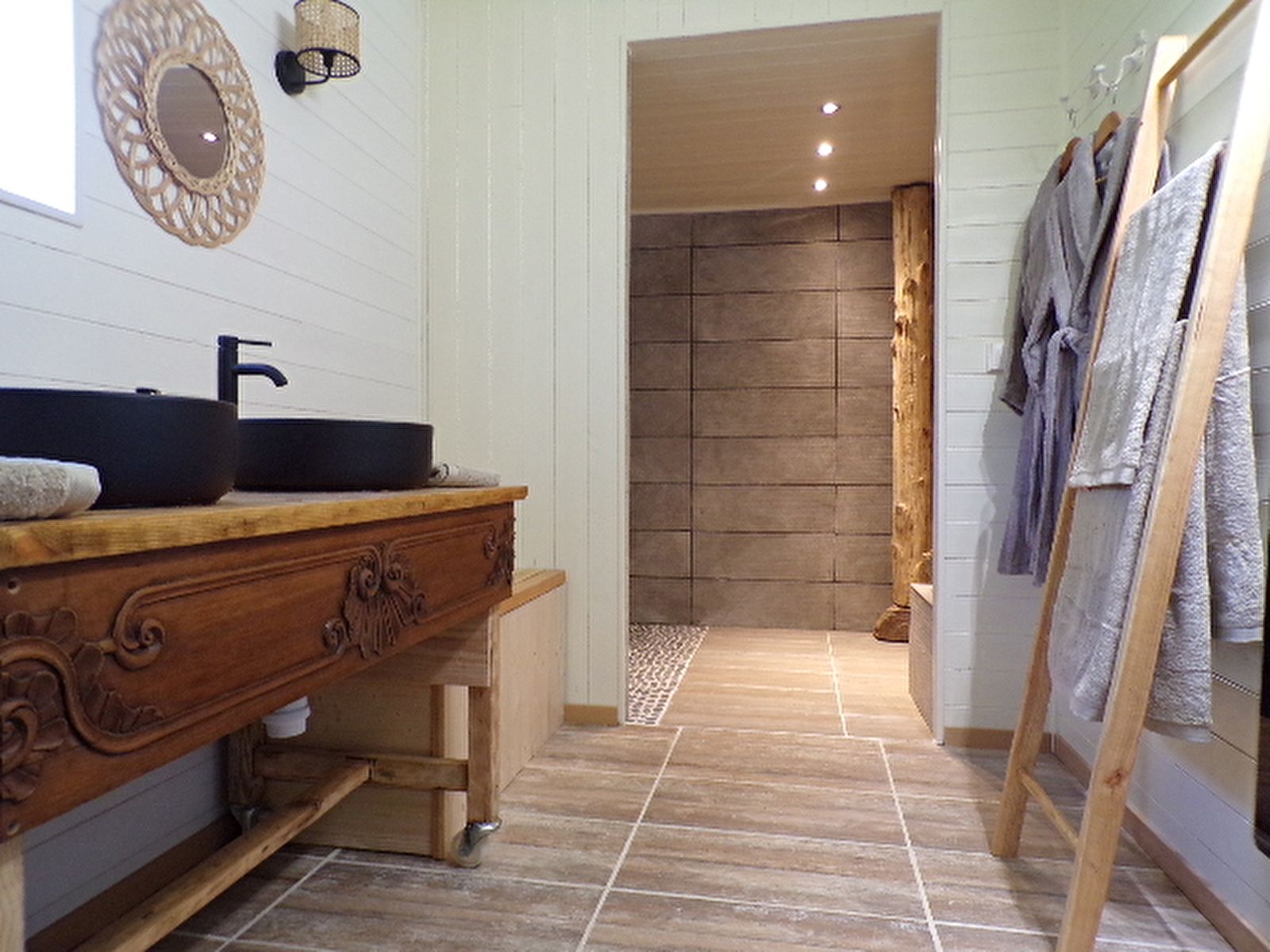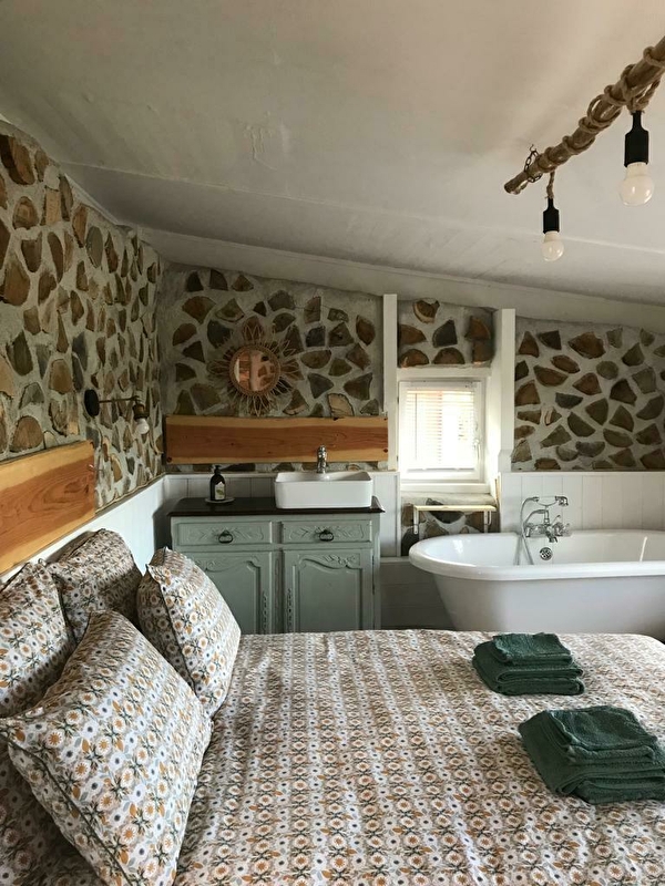 Deux chambres pour deux personnes : 1) une chambre classique avec salle d'eau spacieuse ; et 2) un hébergement atypique « la chambre cabane » avec une baignoire et un lavabo dans la chambre. Toilettes sèches attenantes. Terrasse avec vue panoramique.