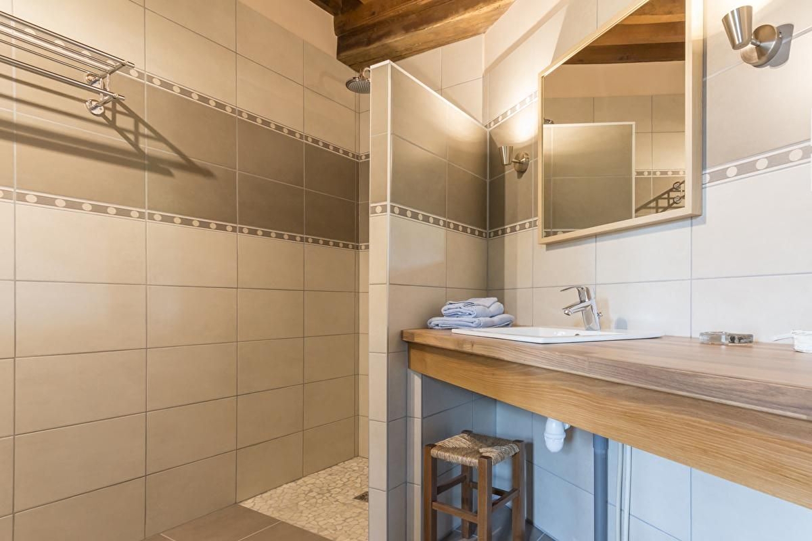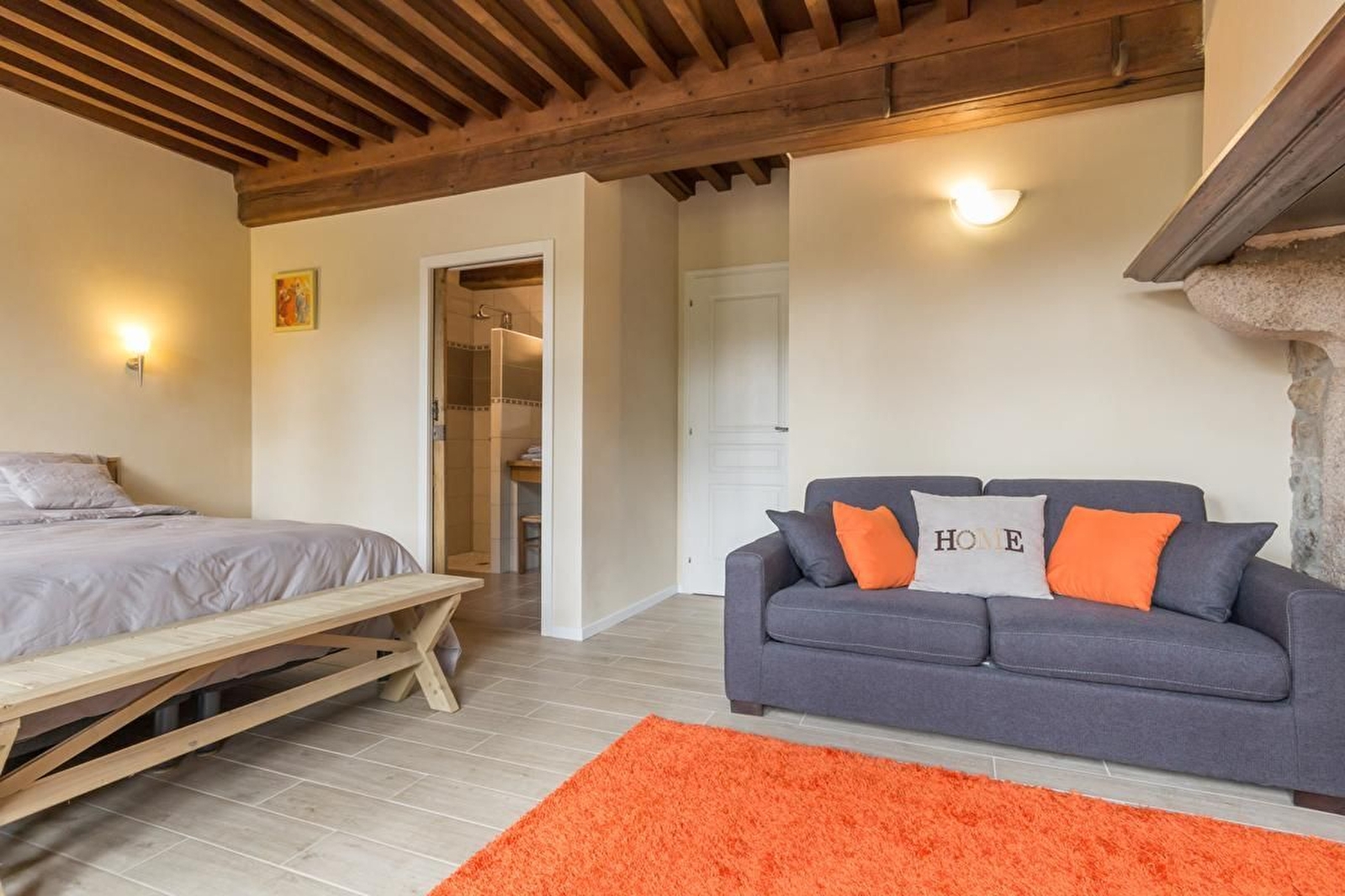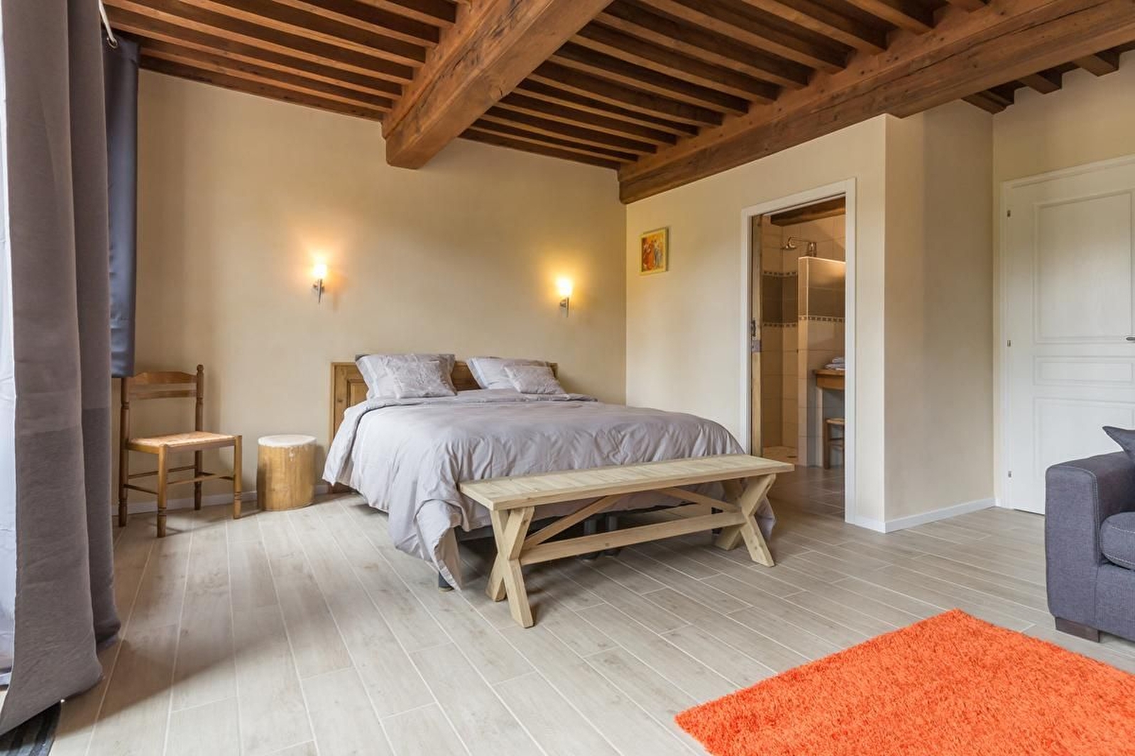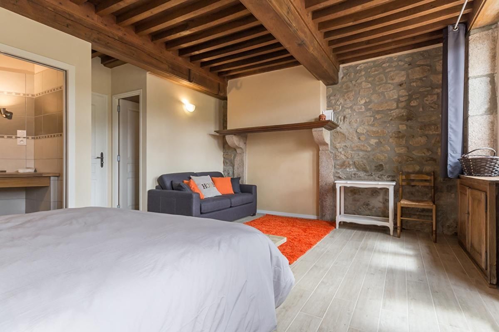 La chambre Spirée est composée de 2 lits 80x200 pouvant être jumelés pour former un lit 160x200, un coin salon avec un canapé convertible pour un couchage supplémentaire, salle d'eau avec douche à l'italienne et wc séparé.