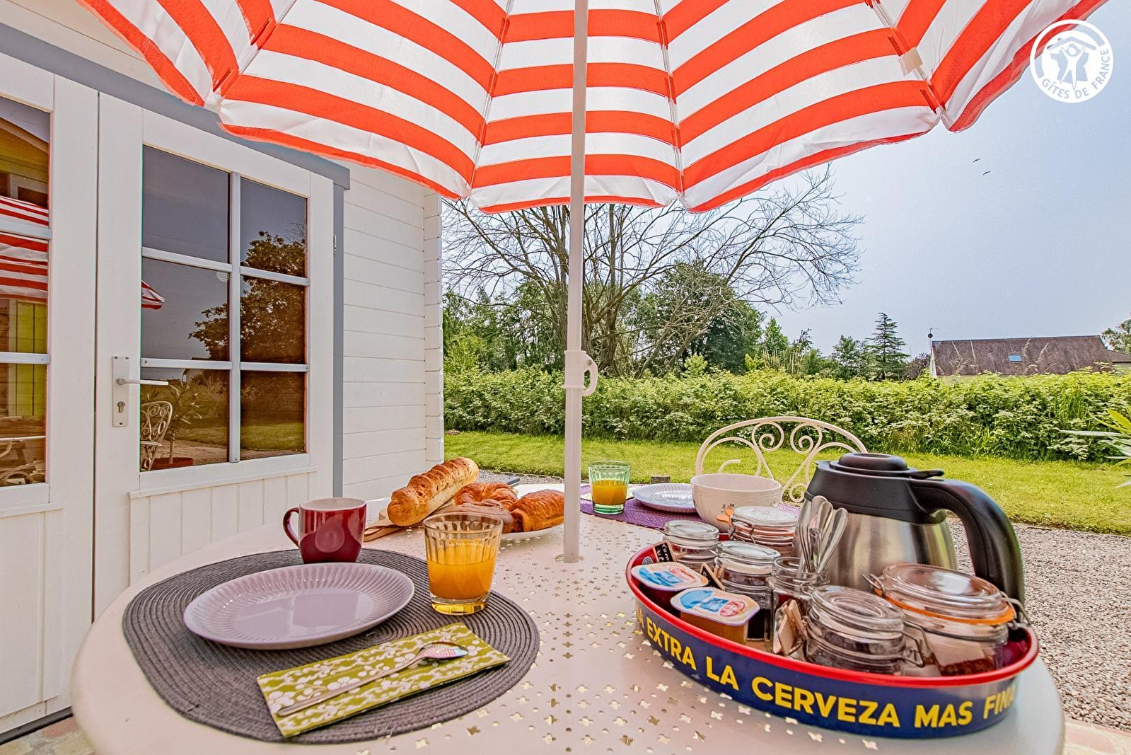 Composition : Roulotte voisinant maison propriétaires (totale indépendance). Wifi (fibre). Chauffage électrique. Climatisation. Espace chambre dans roulotte (lit 2 p. 140x190cm / rdc surélevé 4 marches avec auvent abrité). Annexe privée au rdc de maison propriétaires (directement accessible au pied de la roulotte) comprenant cuisine intégrée complète (plaques induction + four micro-ondes + réfrigérateur/congélateur), salle d'eau (douche/Wc) & espace buanderie (lave-linge). Balconnet abrité + terrasse + local vélos + parking privés. Jardin-cour en commun (2000m²). Restaurant, supérette & petits commerces 1.5 km. Supermarché 5 km.