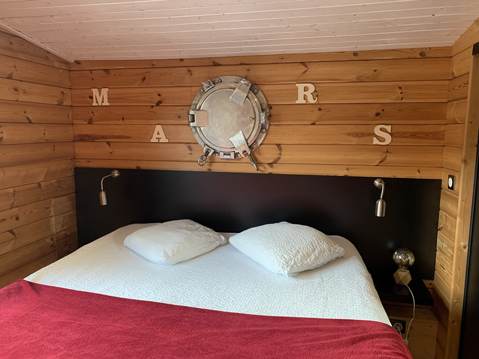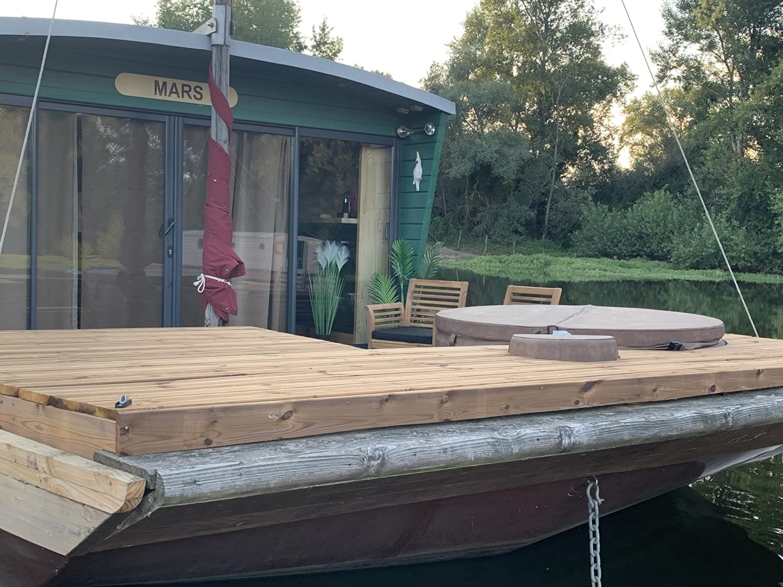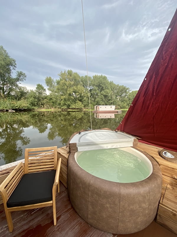 La Toue cabanée SPA est une toue pour 2 personnes avec douche, WC, cuisine, chambre séparée, spa sur la terrasse. Accès en barque.