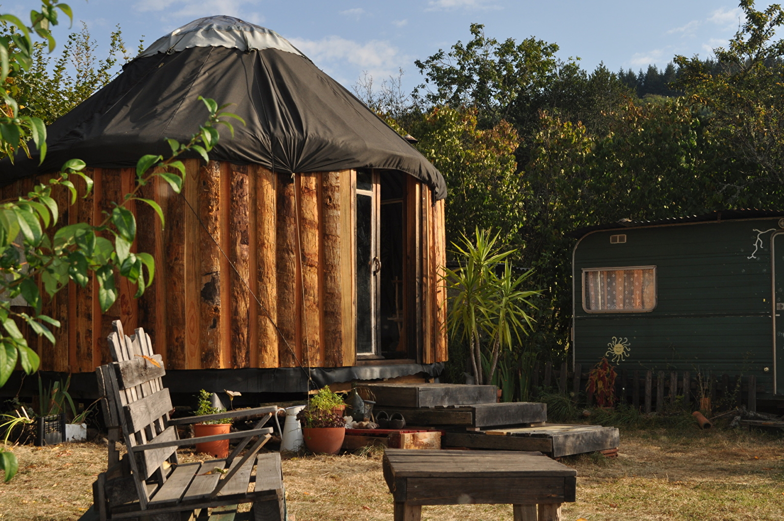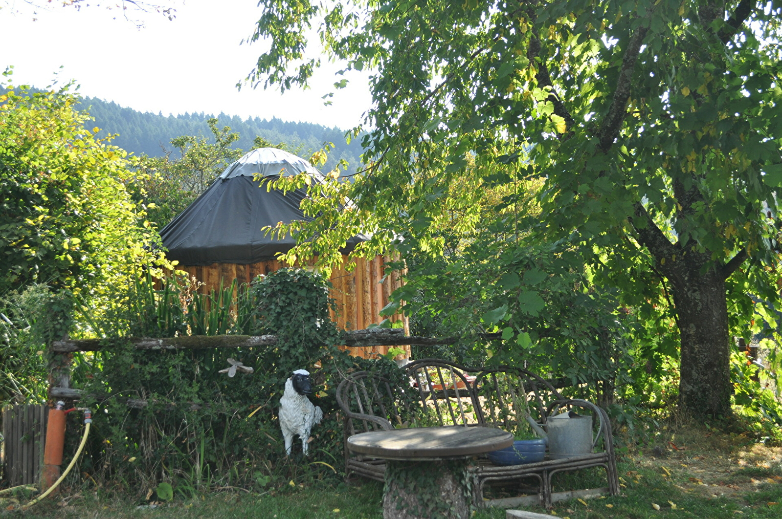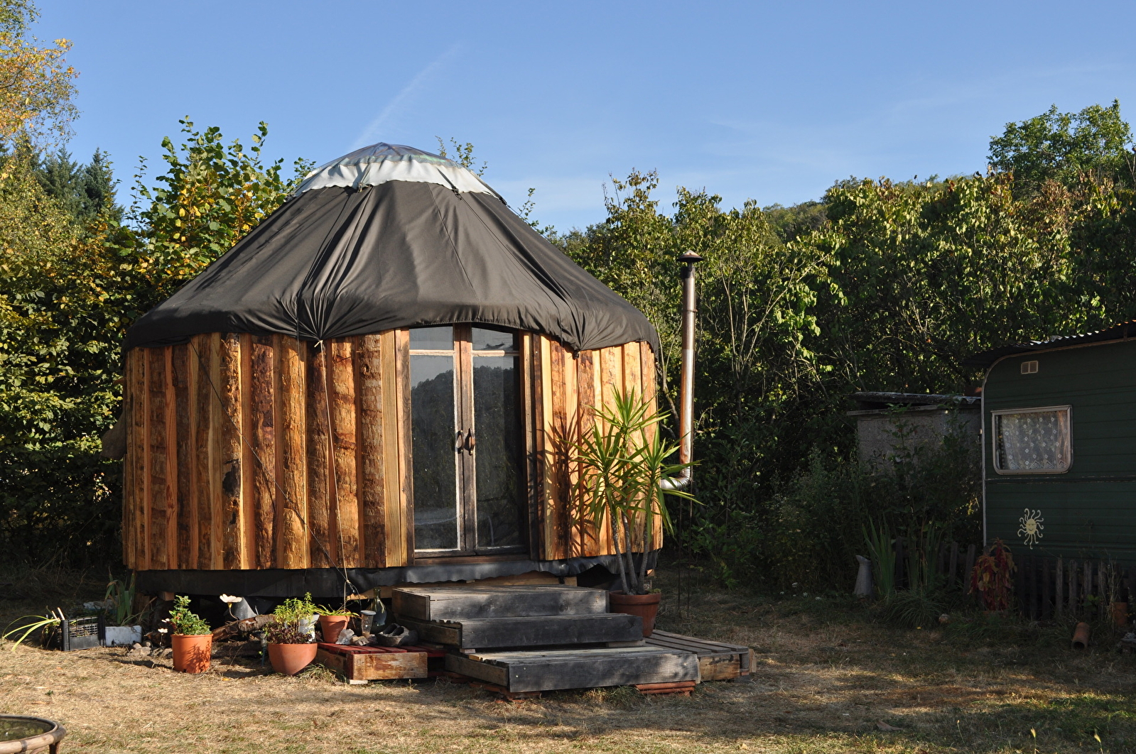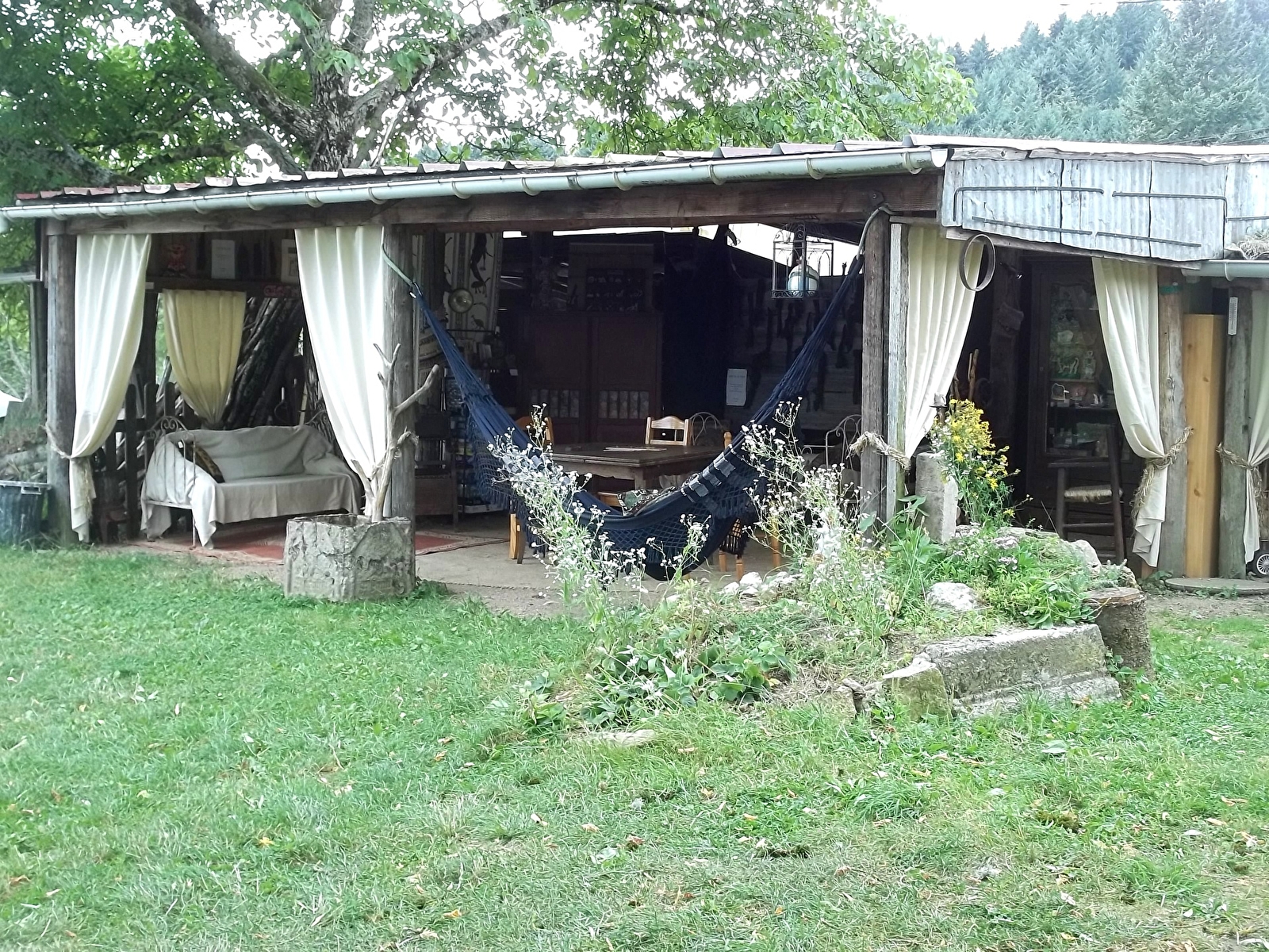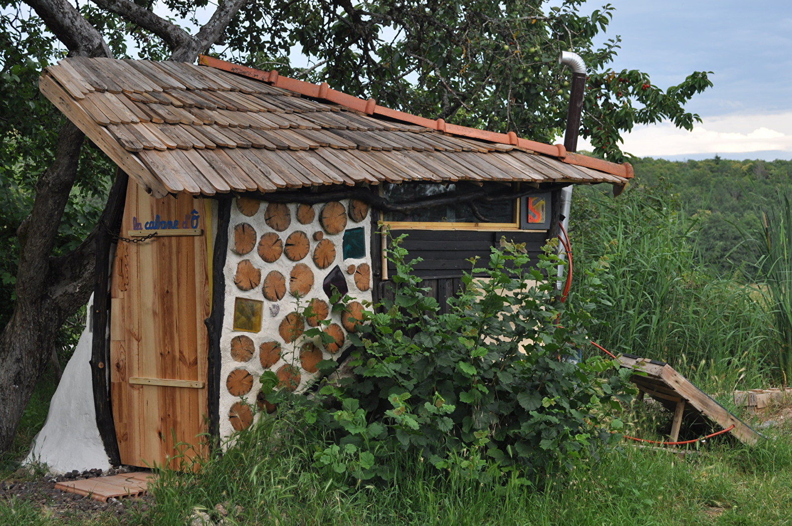 Accès à la "cabane d'eau" artisanale, avec douche chaude sur demande, lavabo et toilettes sèches, à partager avec les éventuels hôtes du Rêv'terre voisin.