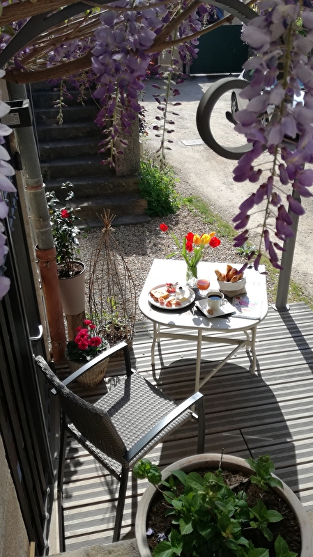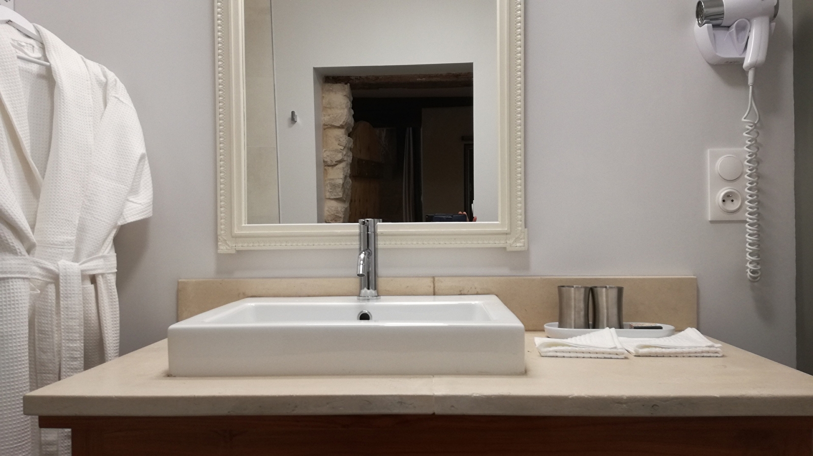 L’antre est aménagé dans la partie médiévale de la maison. Son accès par la terrasse de la tonnelle est indépendant. Pensé comme un cocon, l’aménagement de confort combiné au lustre patrimonial des murs procure un maximum de bien-être. La fraicheur des pierres est garante d’une climatisation naturelle en période estivale. Equipée d’un mini-bar, d’un micro-ondes et d’un nécessaire de vaisselle il vous est possible d’y prendre un repas gourmet déniché parmi les traiteurs avoisinants. Un petit-déjeuner gourmand est servi en chambre pour agrémenter en douceur votre réveil matinal. Peignoirs, serviettes et sèche-cheveux sont à disposition pour parachever une douche relaxante. Le coin TV, la terrasse illuminée des lumières de la guirlande tressée dans la glycine vous invitent à la détente.