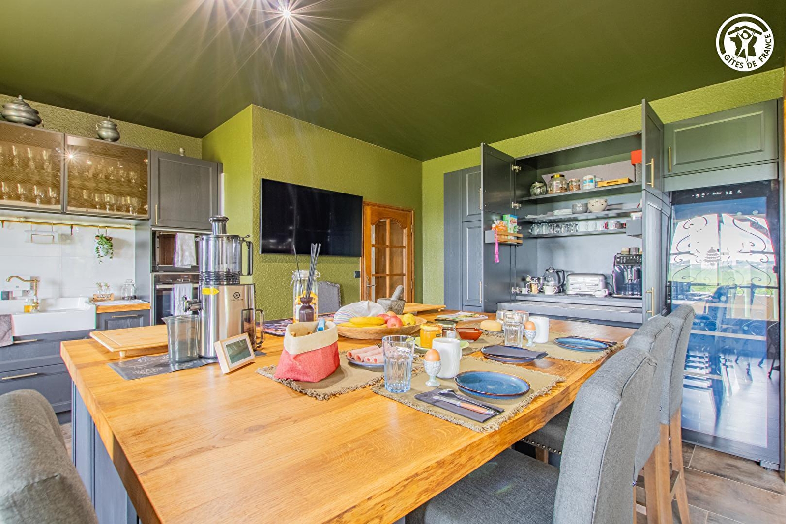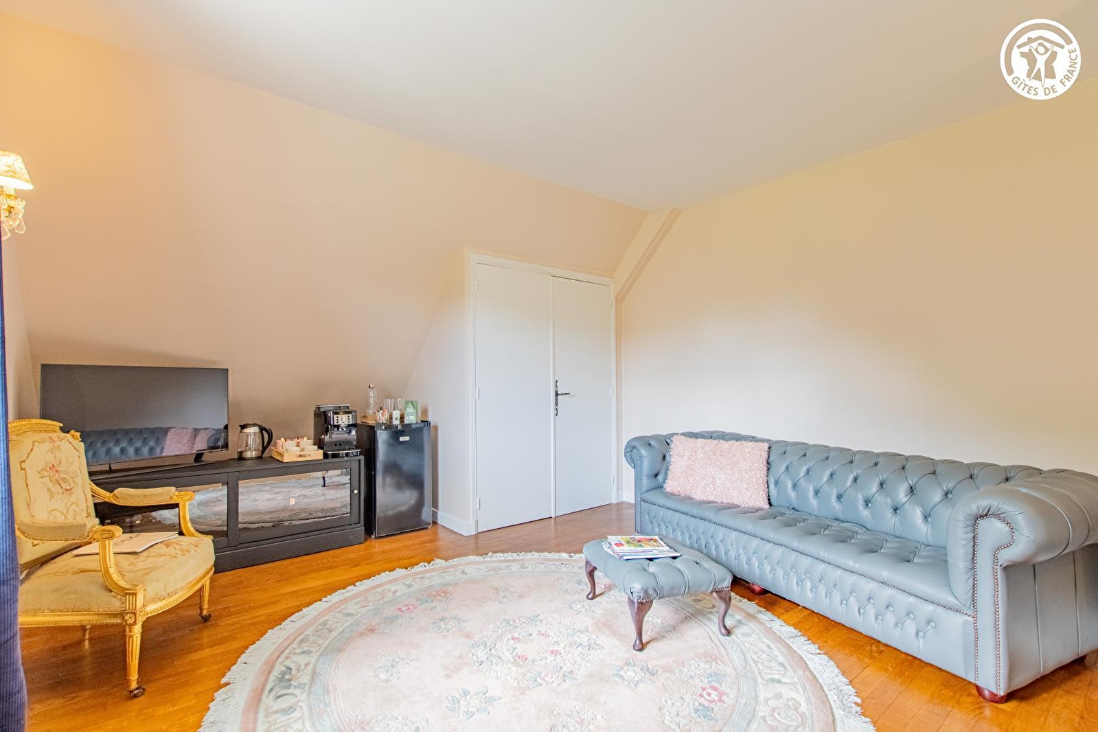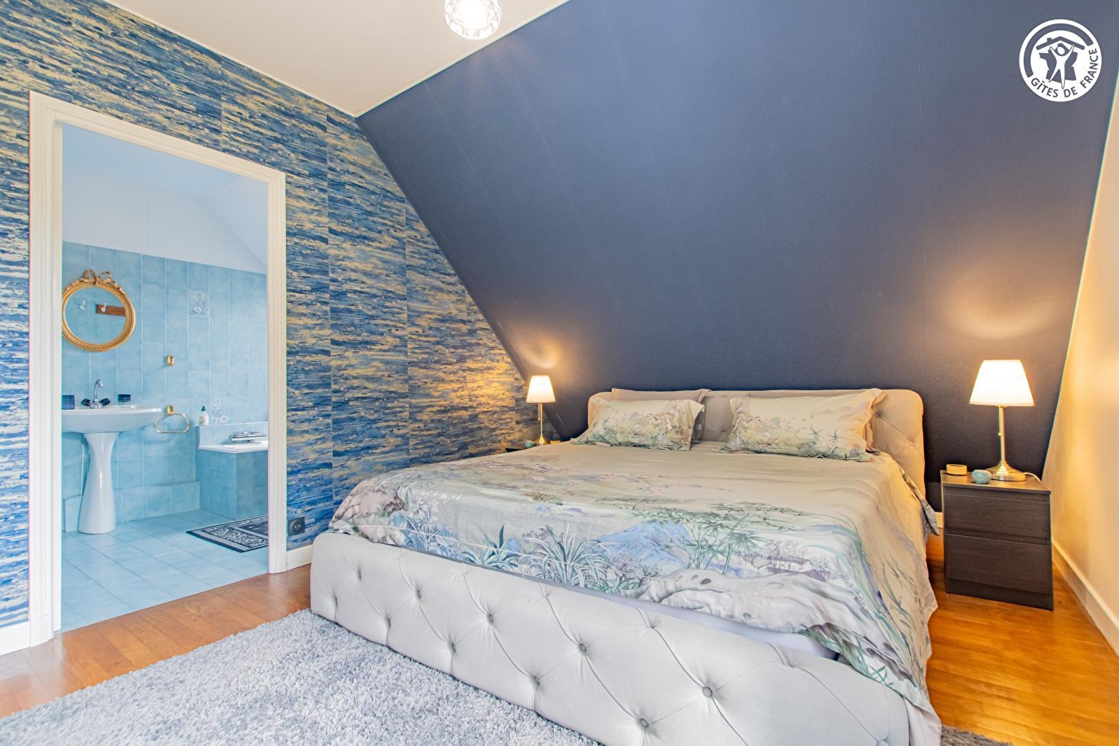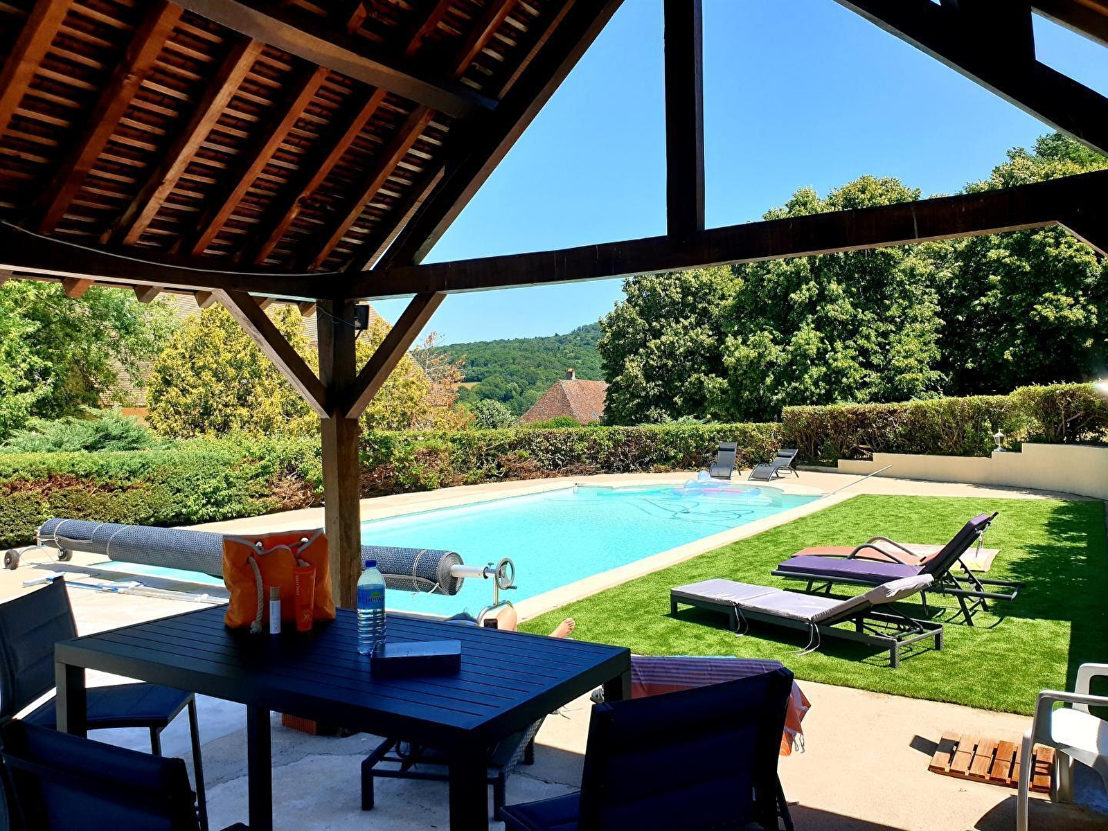 Composition : Chambre au 2ème étage (intégralement privatisé) en accès indépendant (par un seul niveau / maison à flanc de pente comprenant également un gîte au rdc). Wifi (fibre). Chauffage central fioul. Suite comprenant une chambre (lit 2 p. 180x200cm) + salon avec réfrigérateur & TV (bouquet Canal+/Netflix/Prime…). Salle de bain privative (baignoire). Wc indépendant + seconde sdb (baignoire "balnéo") "sur pallier" (immédiat). Petits déjeuners servis dans pièce de vie des propriétaires. Propriété (1000m²) avec piscine chauffée (14x6m) en commun. Parking privé. Local vélos. Supermarché 2.5 km. Restaurant à 600m.
