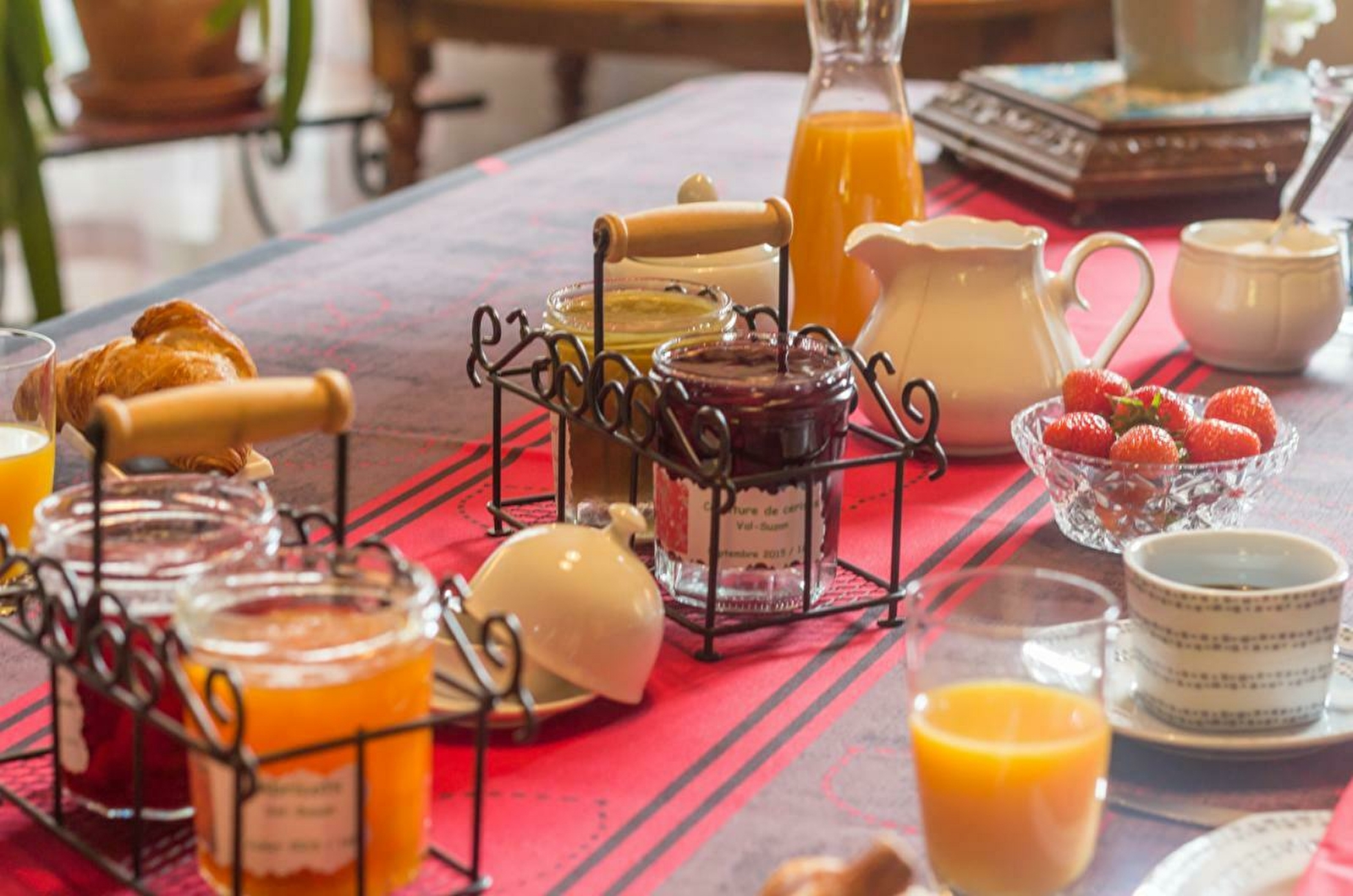 Les petits déjeuner sont servis au rez-de-chaussée dans une grande salle aux décors rustiques et devant un feu de cheminée en période hivernale.