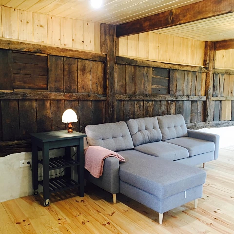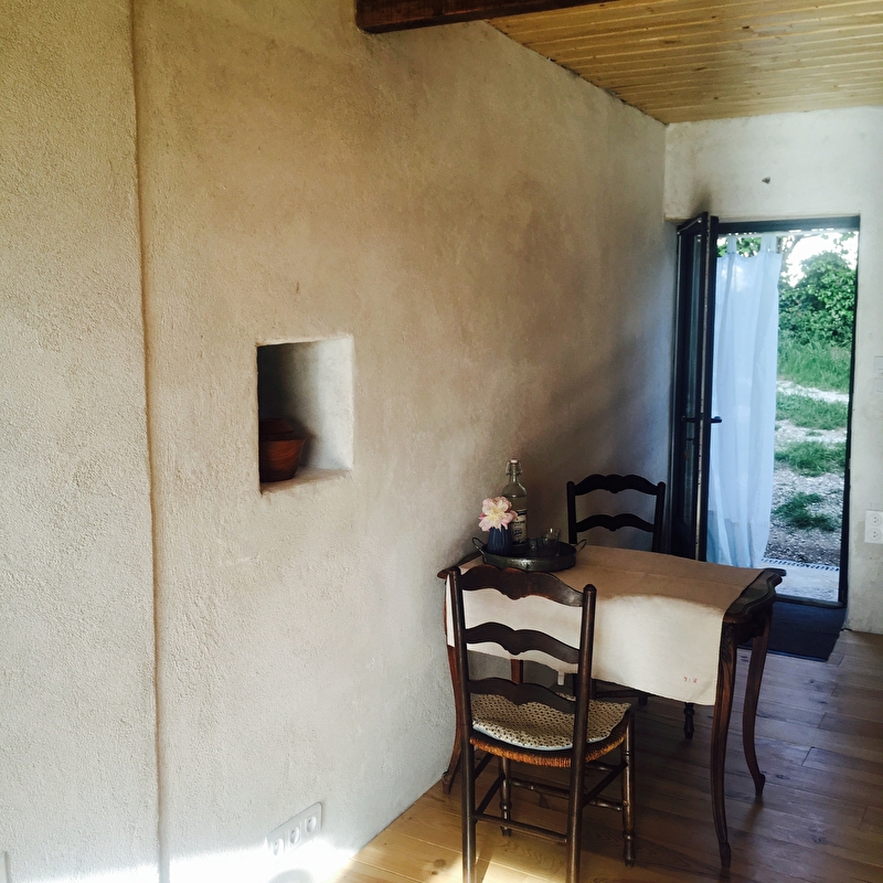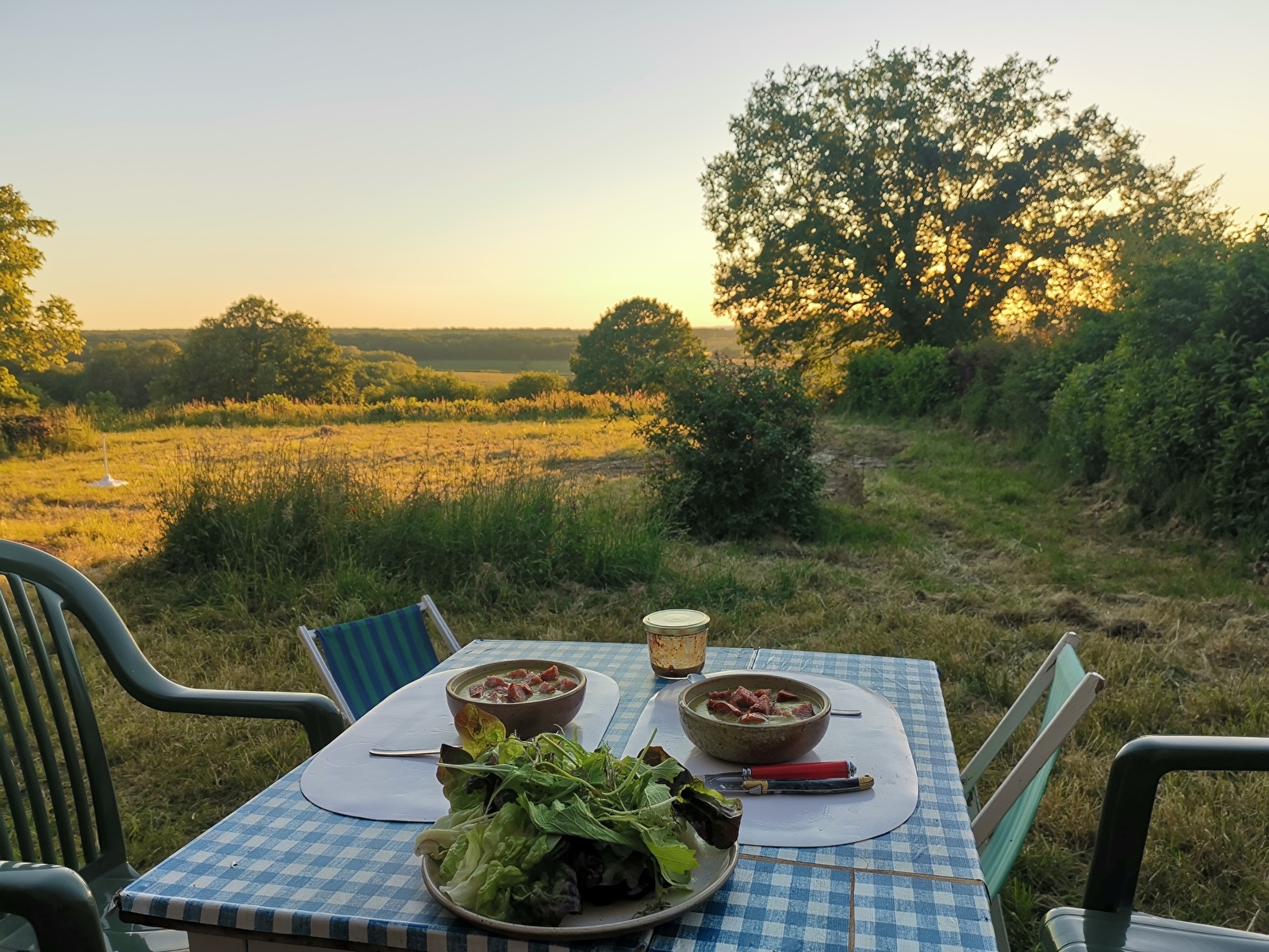 L'ancienne étable a été aménagée en chantier participatif pour un studio confortable et lumineux, avec poêle à bois et baie vitrée panoramique vers le coucher de soleil sur Vézelay.