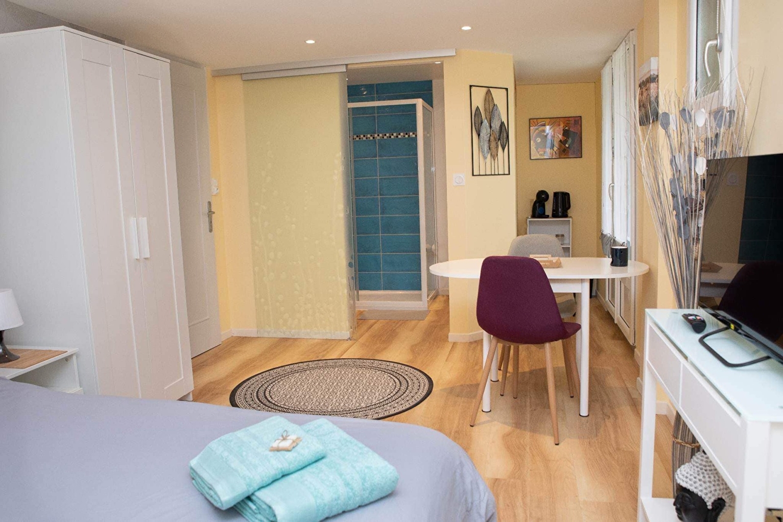 TV, connexion internet, bouilloire et machine à café et frigo à disposition.