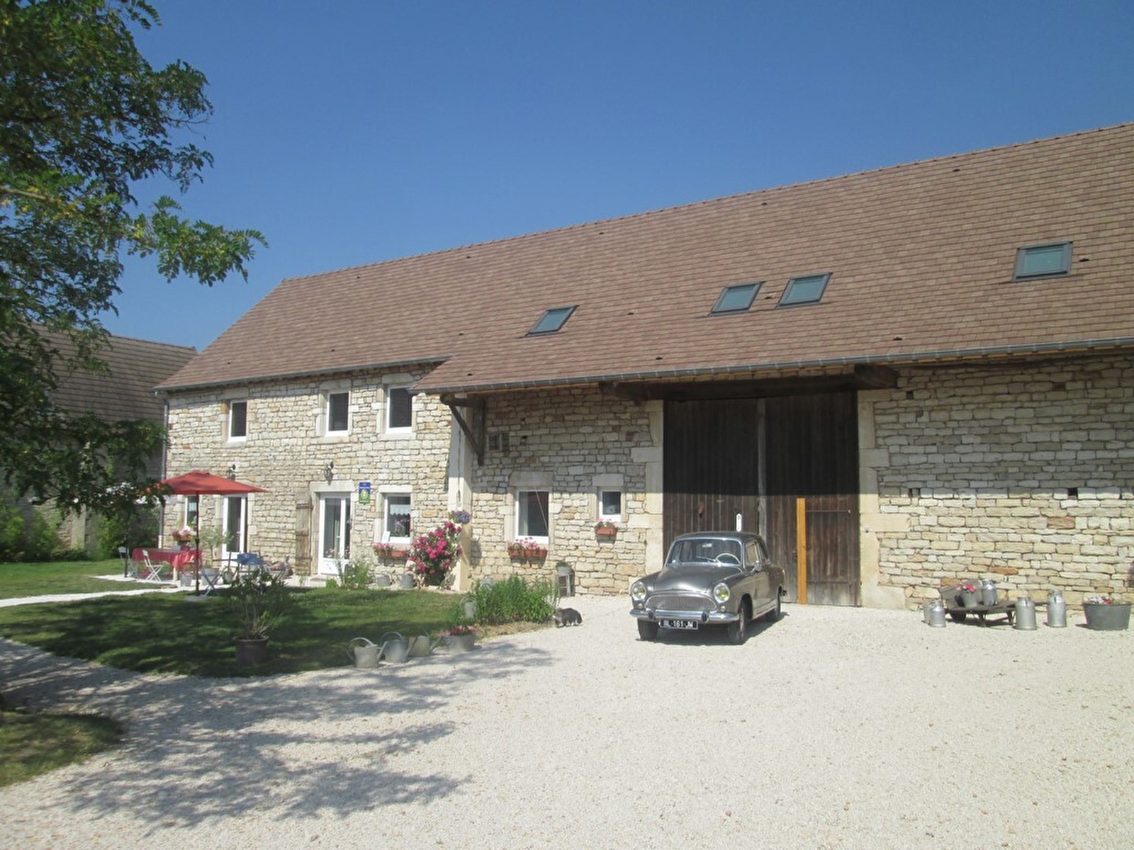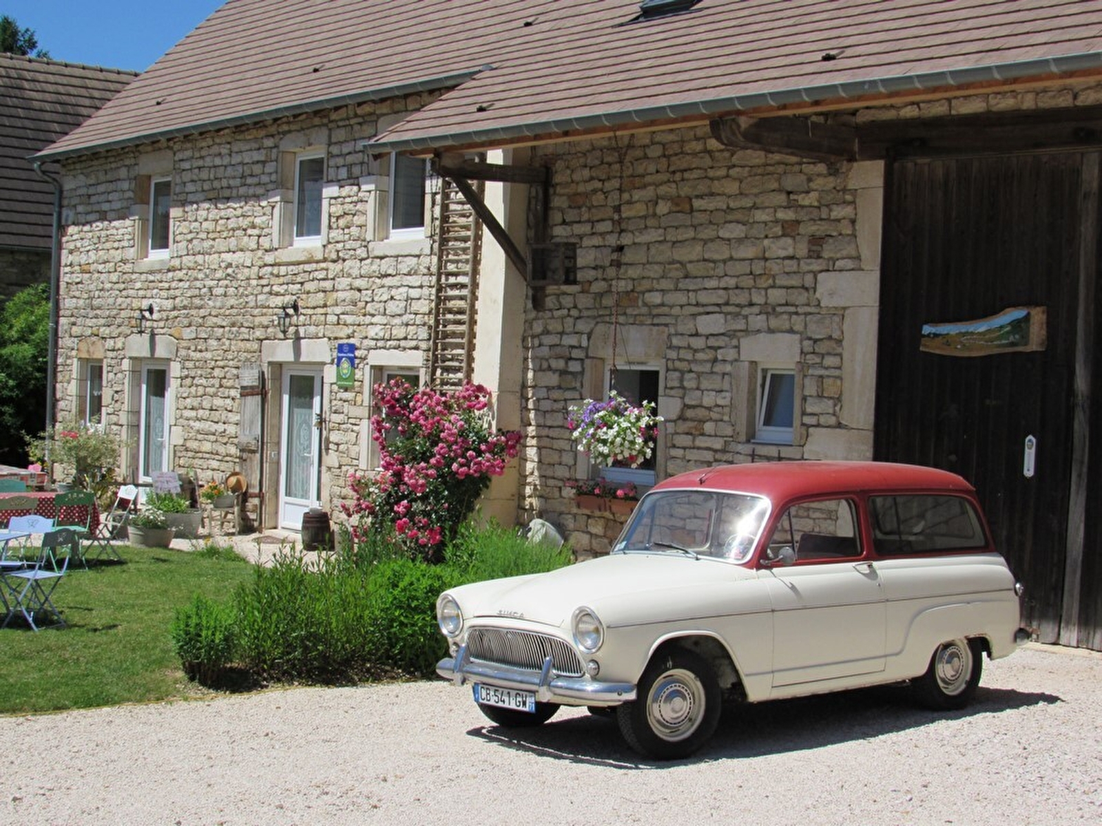 François, collectionneur passionné d'anciennes « SIMCA Aronde » - mythique berline familiale française ayant inspiré le nom de la maison, dont vous pourrez découvrir plusieurs exemplaires entreposés sur place sous un préau côté cour - et Laure vous accueillent au sein d'une élégante grange traditionnelle de caractère du 19ème siècle, restaurée avec soin dans les règles de l'art, lovée sur un ancien domaine agricole familial intégralement revisité en confortable villégiature. Environnement calme, en bordure de ruelle au cœur d'un bourg résidentiel (sis en toute proximité de l'A6 & du centre-ville de Chalon-sur-Saône & ses commodité), en pleine campagne péri-urbaine chalonnaise, écrin rural & viticole préservé, alternant champs, coteaux de vignobles, étangs et bois dont la vaste forêt domaniale de Gergy, poumon vert du territoire à parcourir lors d'apaisantes promenades à pied comme en VTT. Spacieuses chambres de bon confort principalement lovées sous les toits dans l'esprit de cocons douillets. Chaleureux cachet campagnard sublimé par les traces architecturales des lieux (murs en pierres & charpente d'origine). Agréable jardin végétalisé.